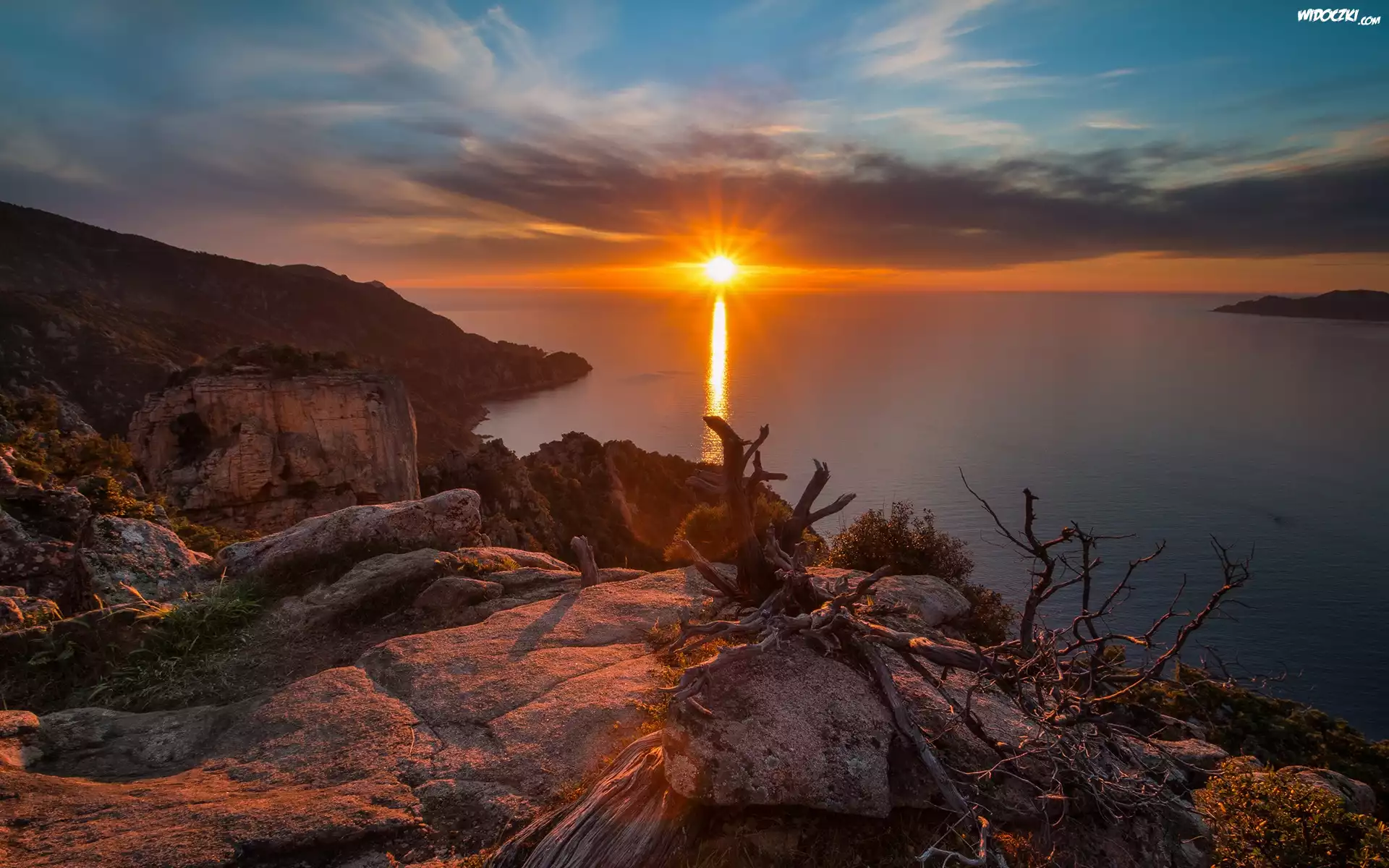 Zdjęcia, Skały, Zachód, Słońca, Suchy, Pień, Drzewa, Gałęzie