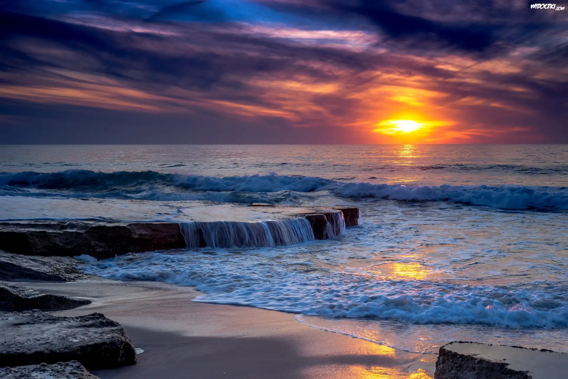 Zdjęcia, Zachód słońca, Morze, Skały, Brzeg