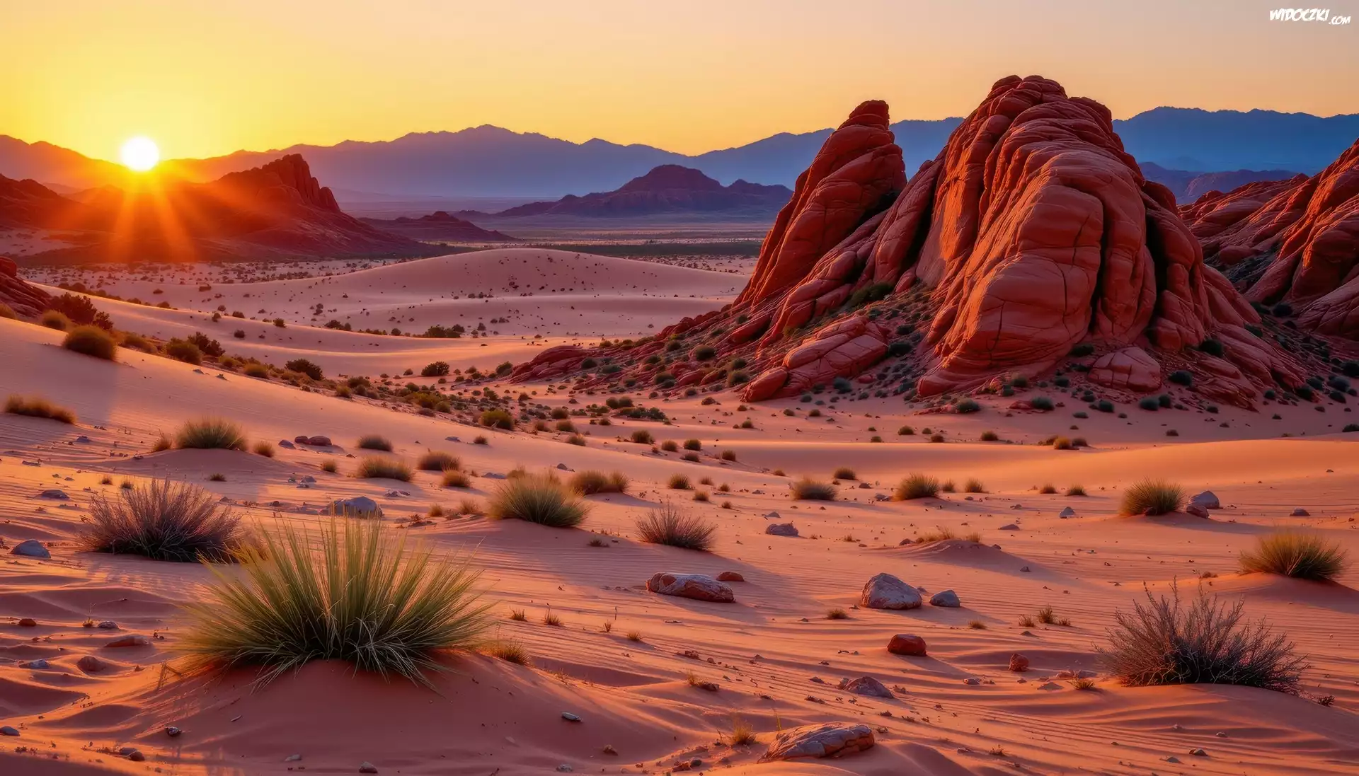 Zdjęcia, Pustynia, Rośliny, Skały, Zachód słońca, Grafika AI