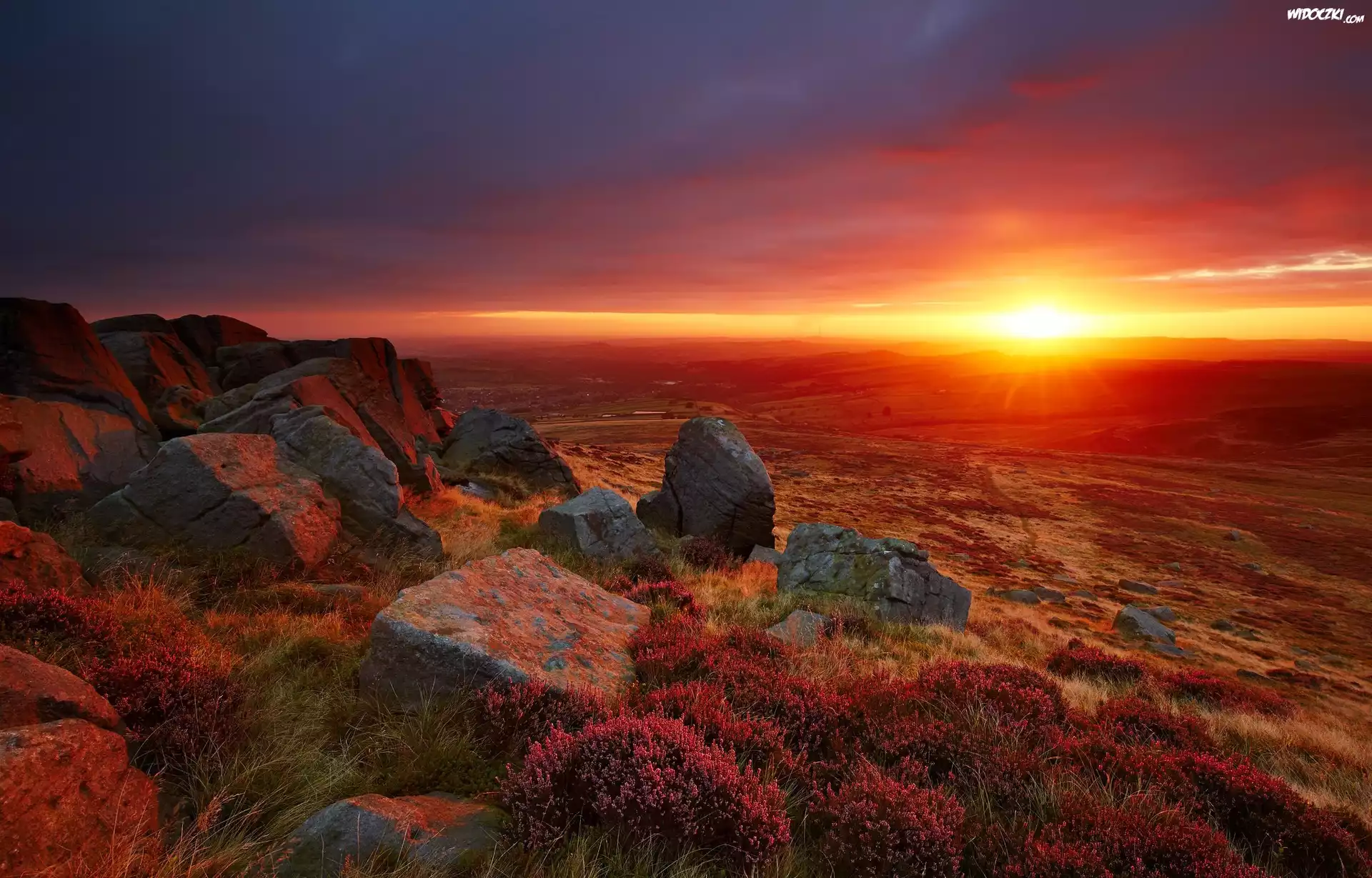 Zdjęcia, Zachód słońca, Skały, Wrzos