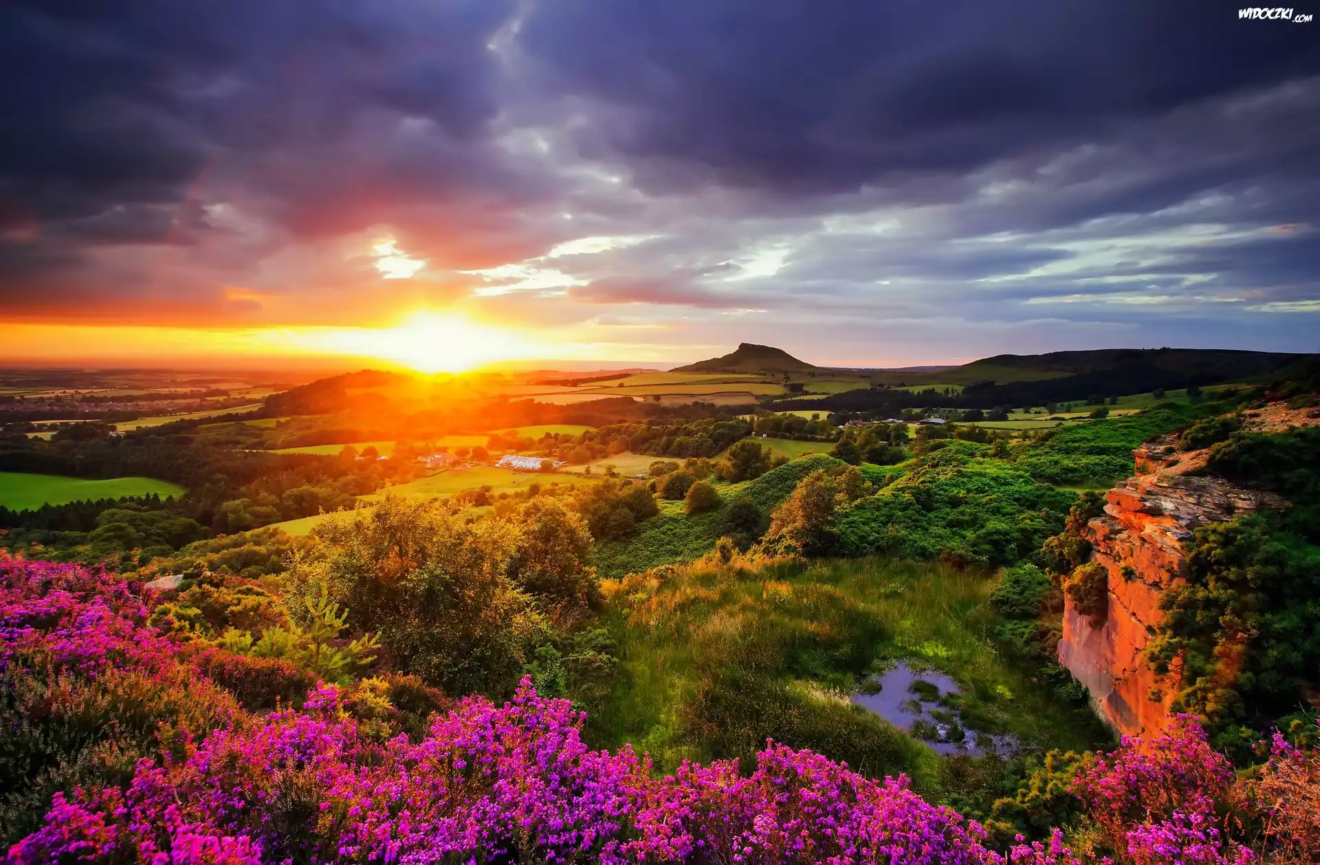 Zdjęcia, Zachód słońca, Wzgórza, Dolina, Skały, Kwiaty