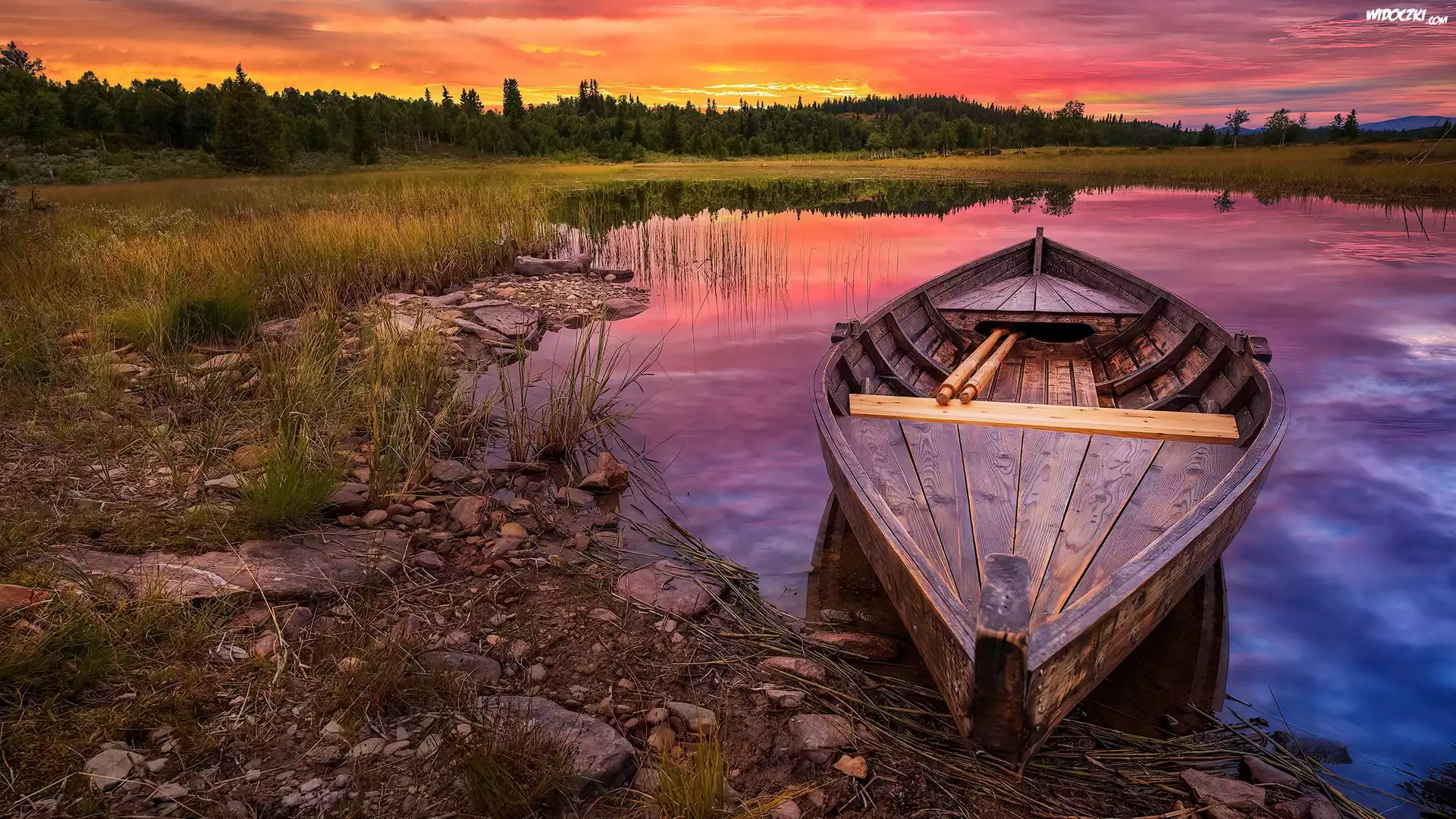 Zdjęcia, Jezioro, Zachód Słońca, Łódka, Drzewa