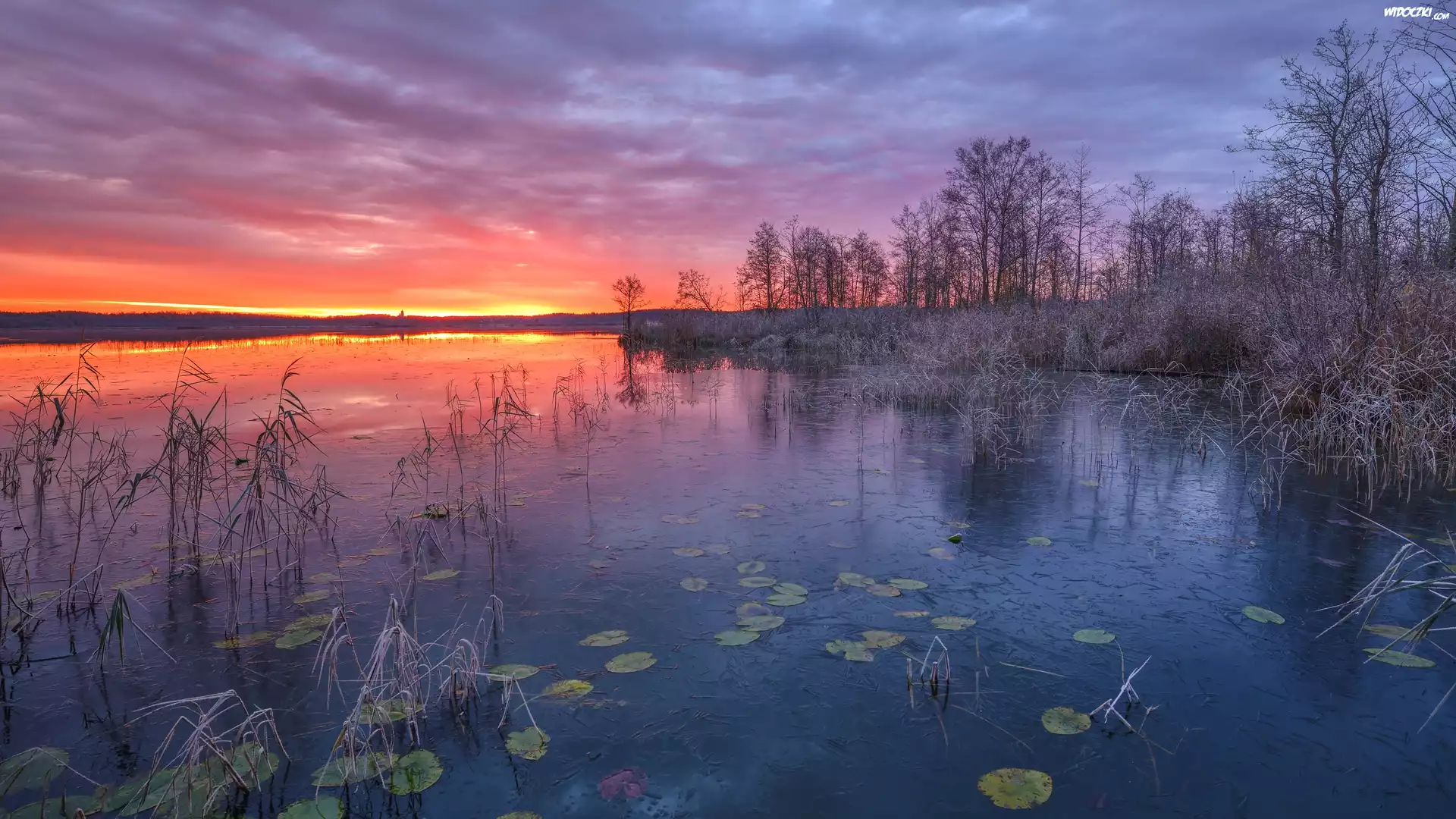 Jezioro, Zachód słońca, Szuwary, Drzewa