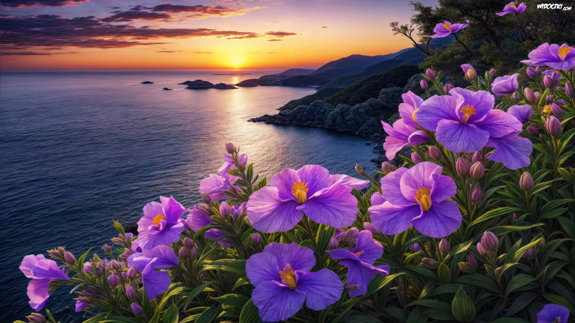 Zdjęcia, Morze, Zachód Słońca, Kwiaty, Fioletowe