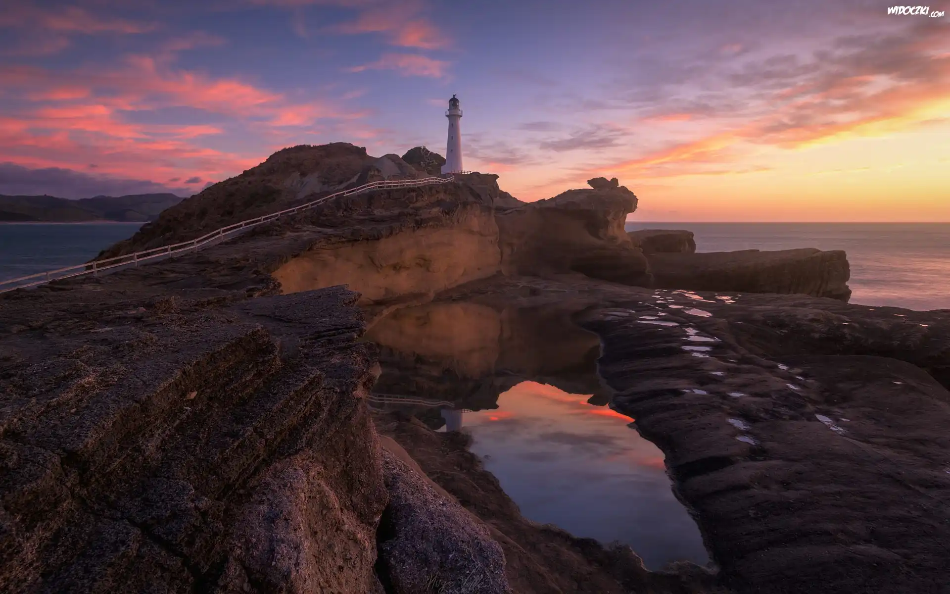 Zdjęcia, Morze, Skały, Latarnia morska, Castlepoint Lighthouse, Zachód słońca, Castlepoint, Nowa Zelandia