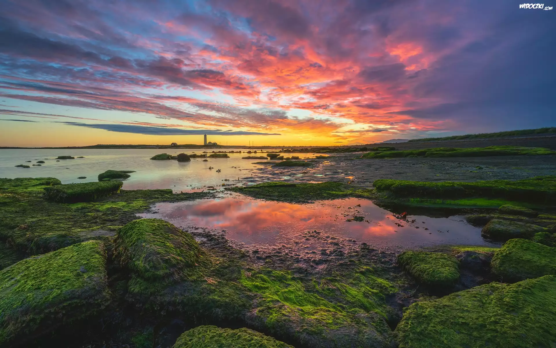 Morze, Latarnia morska, Grotta Island Lighthouse, Zachód słońca, Wybrzeże, Reykjavík, Islandia