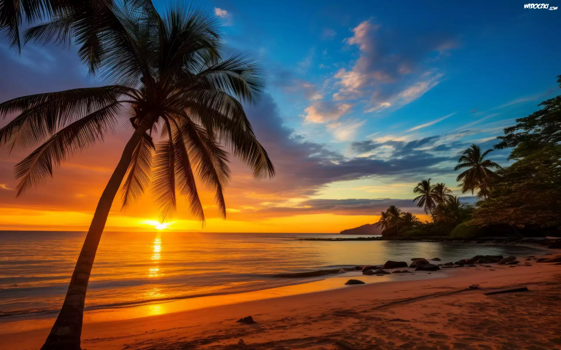 Zdjęcia, Morze, Zachód słońca, Plaża, Palmy
