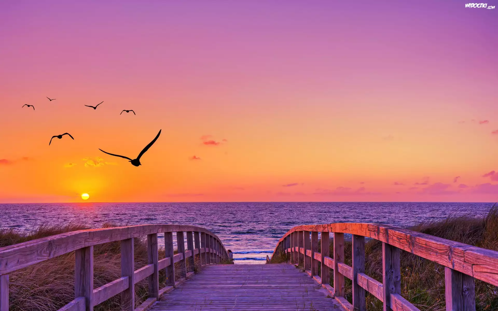 Morze, Zachód słońca, Mewy, Pomost