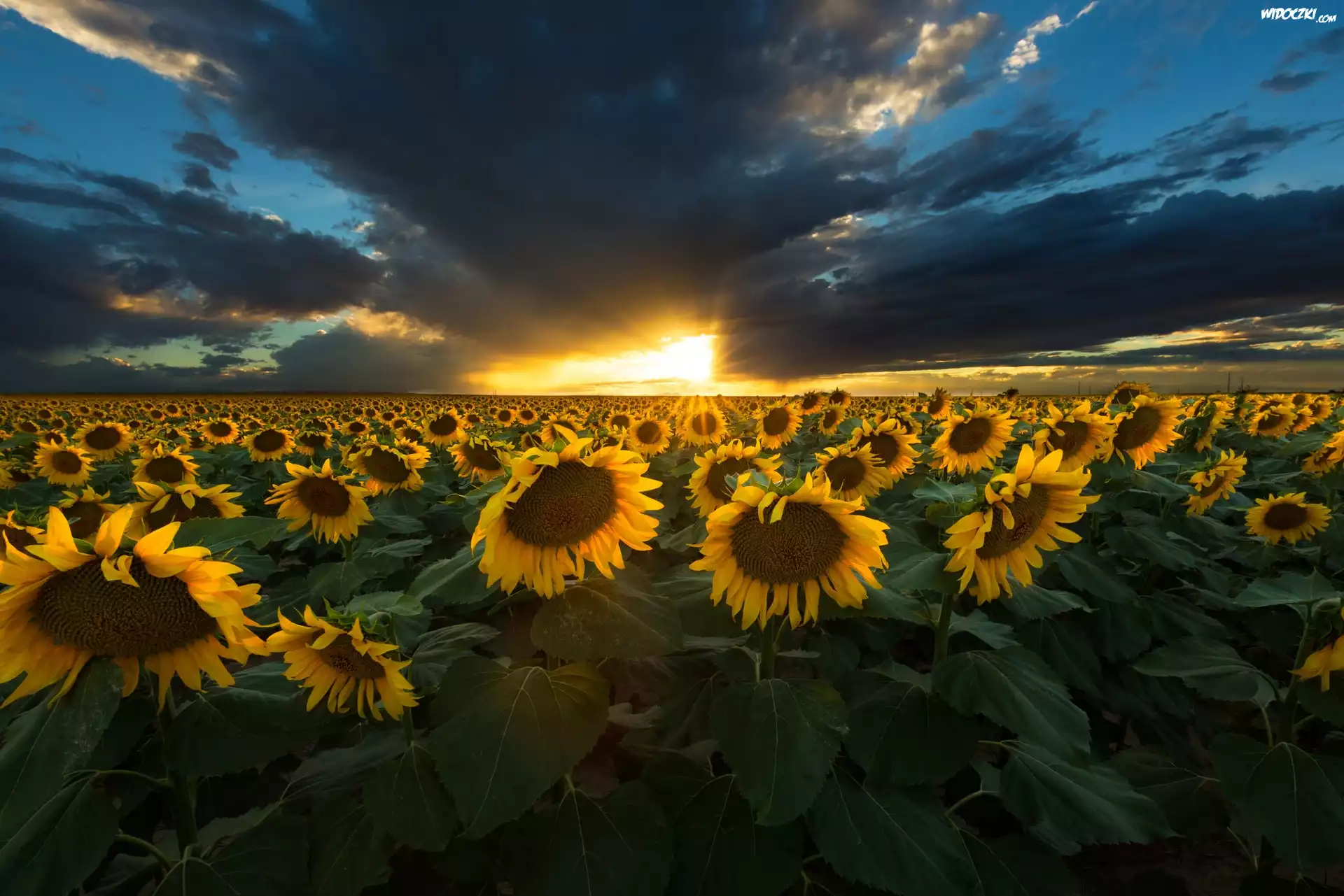 Zdjęcia, Zachód słońca, Chmury, Słoneczniki, Plantacja