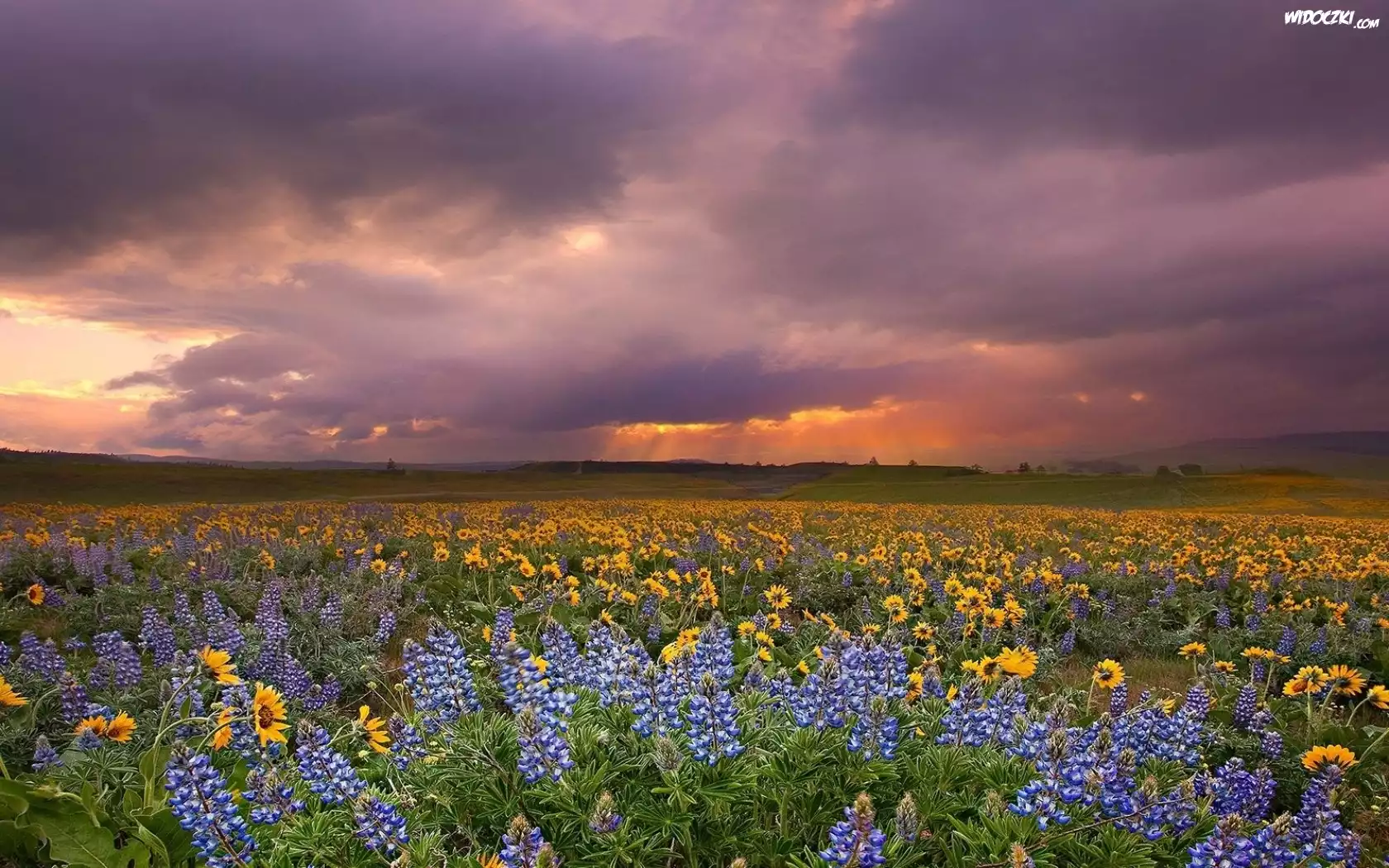 Zdjęcia, Zachód, Słońca, Słoneczniki, Łubin