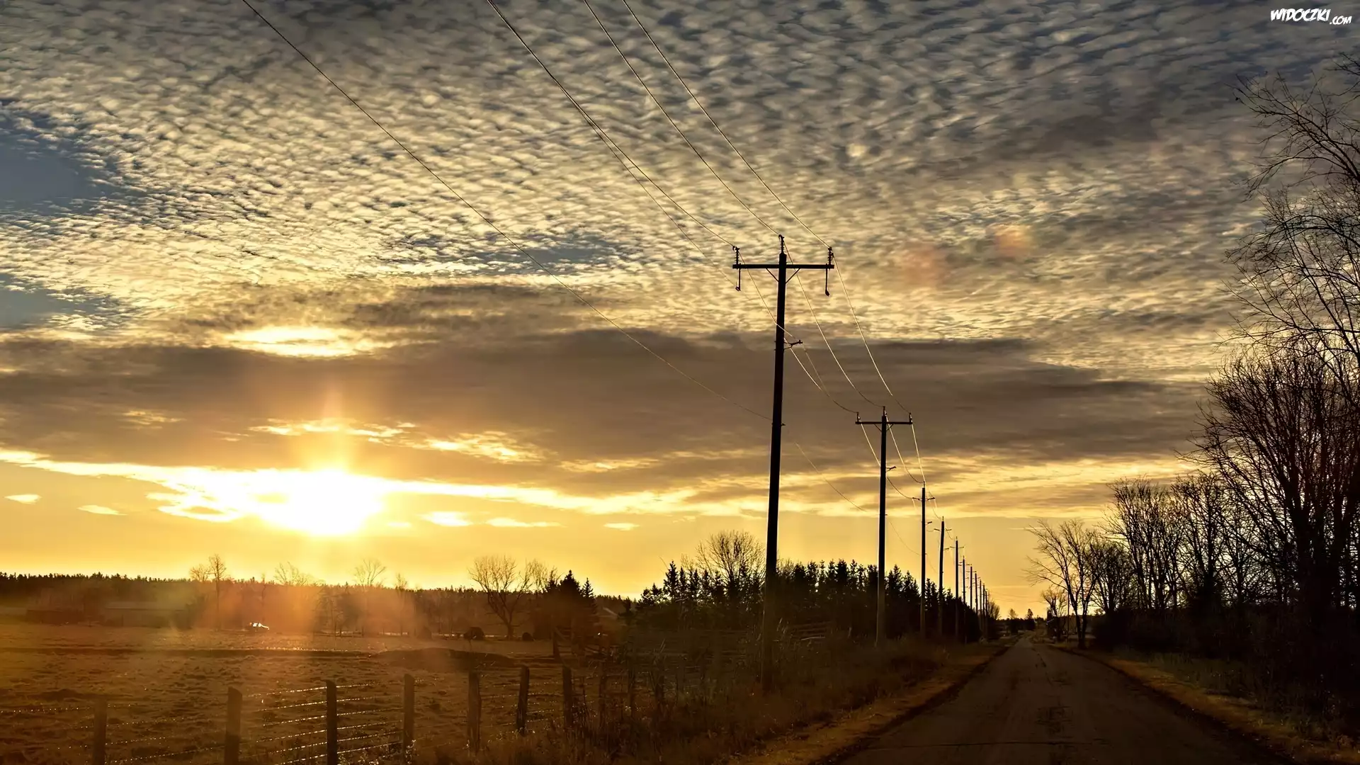 Zdjęcia, Zachód, Słońca, Droga, Słupy, Drzewa