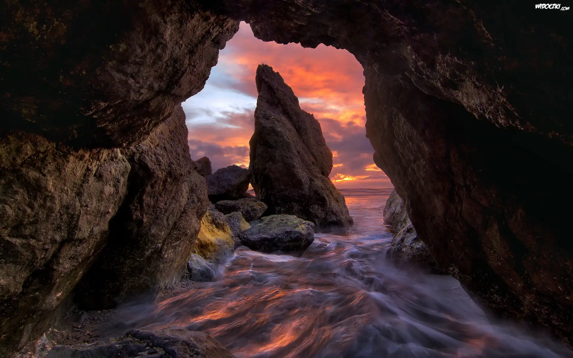 Zachód słońca, Jaskinia, Skały, Morze, Kamienie, Plaża Ruby Beach, Park Narodowy Olympic, Stan Waszyngton, Stany Zjednoczone |