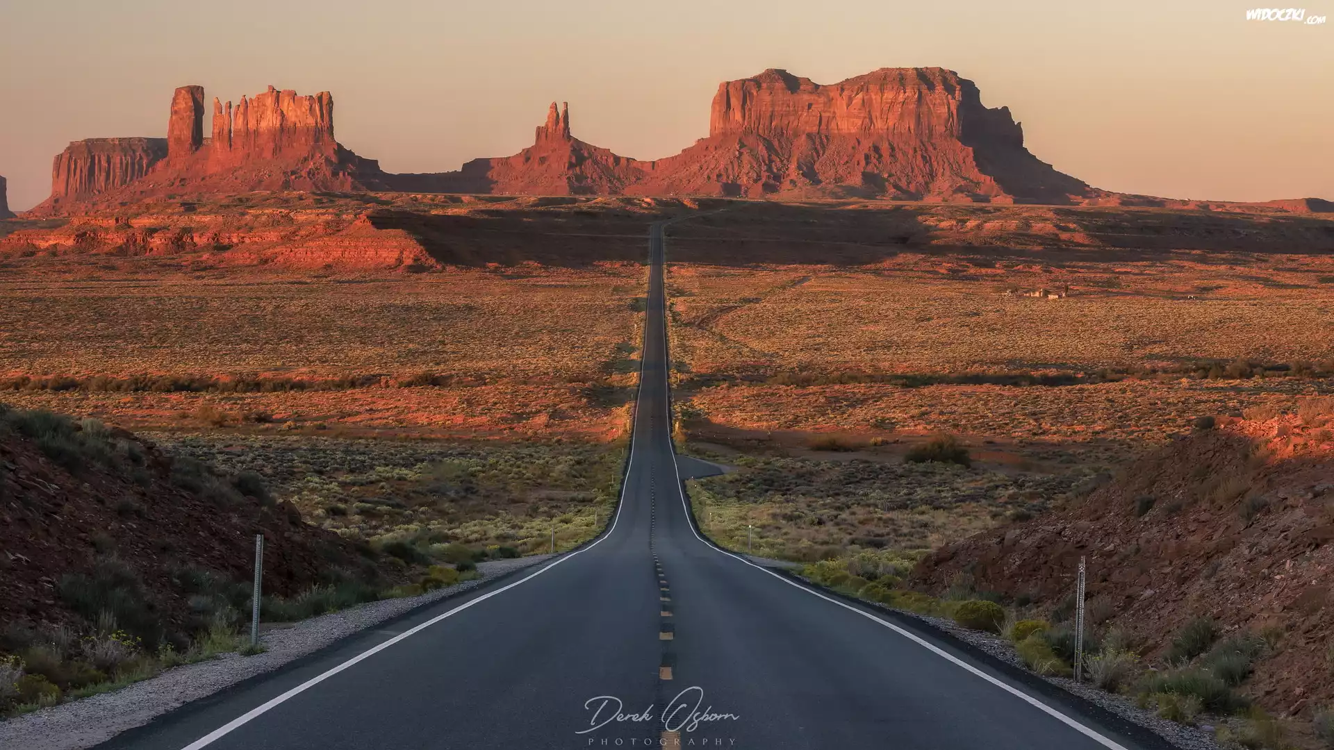 Zachód słońca, Droga, Jesień, Skały, Dolina Pomników, Wyżyna Colorado, Monument Valley, Stan Utah, Stany Zjednoczone |