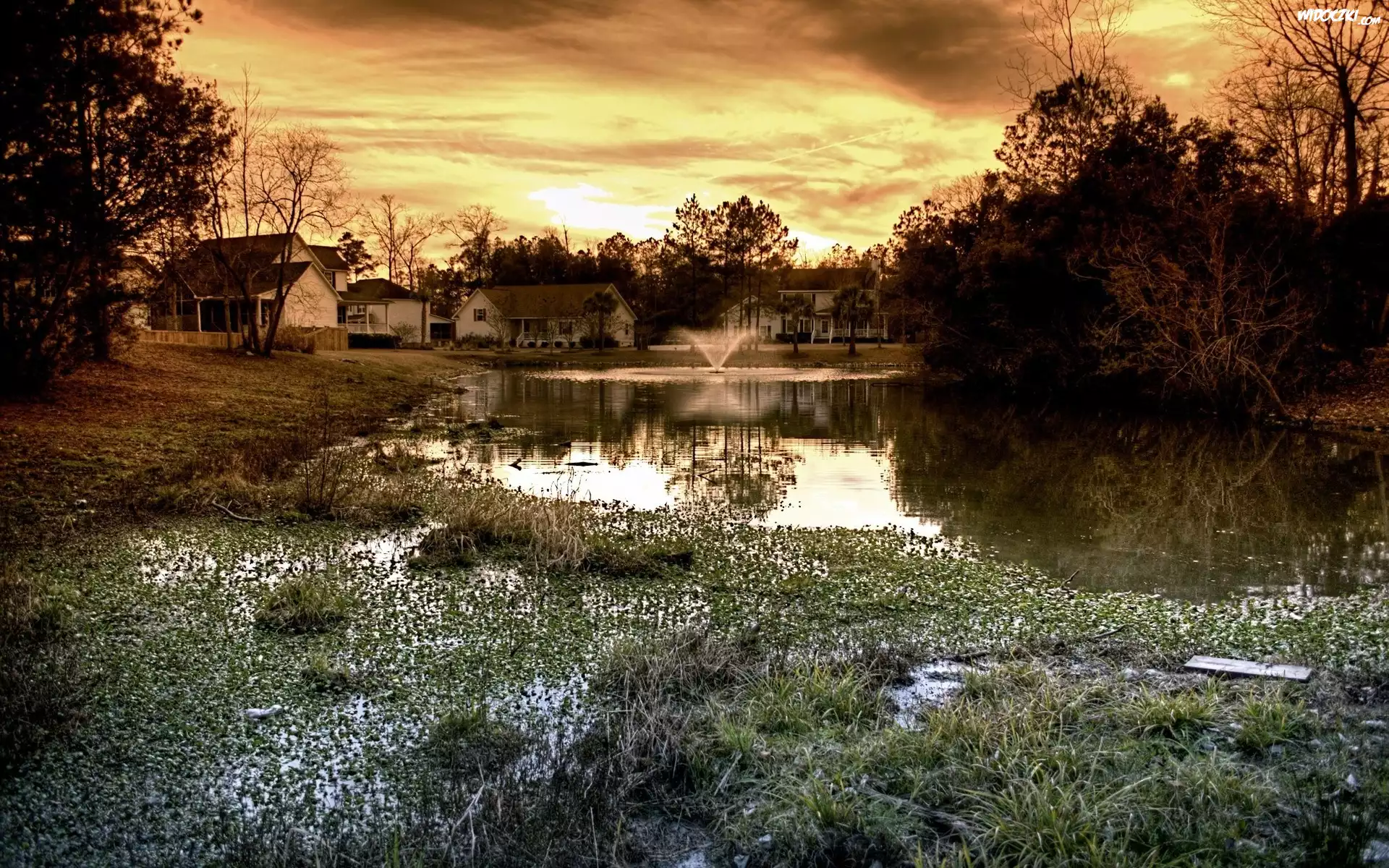 Zdjęcia, Zachód, Słońca, Staw, Budynki