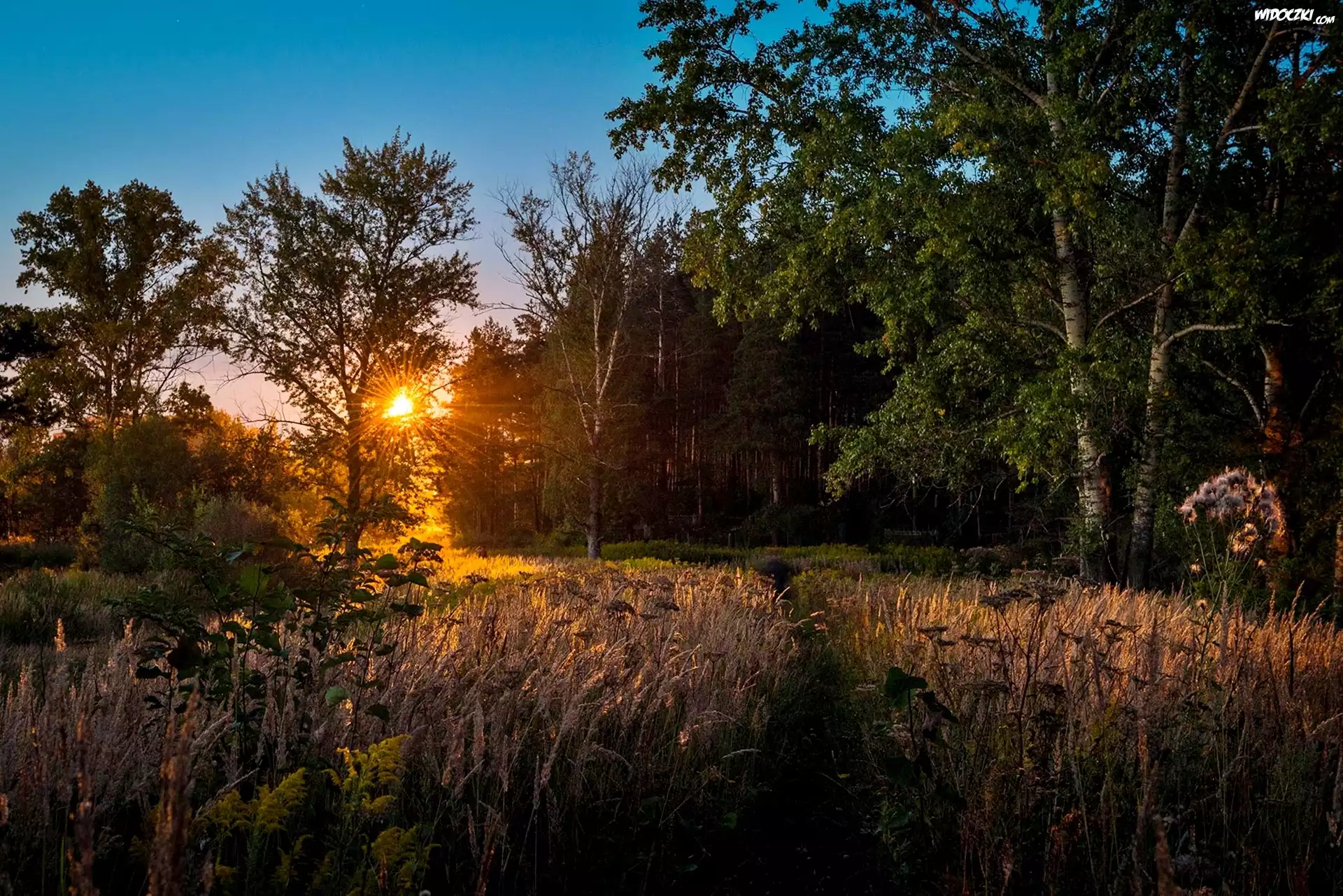 Zdjęcia, Zachód, Słońca, Las, Suche, Trawy
