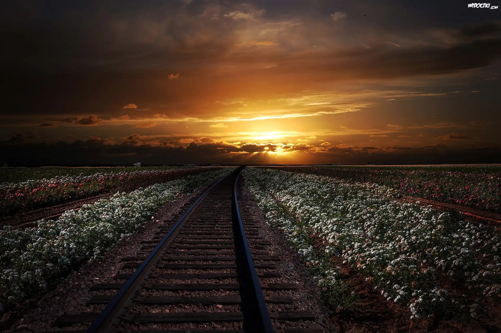 Zdjęcia, Zachód, Słońca, Tory, Kwiaty