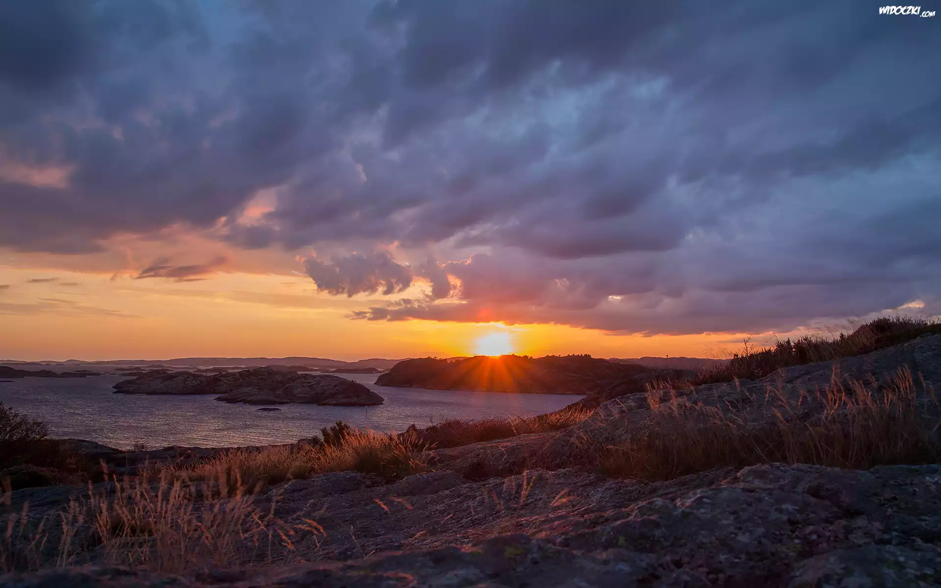 Zachód słońca, Chmury, Skały, Trawa, Morze