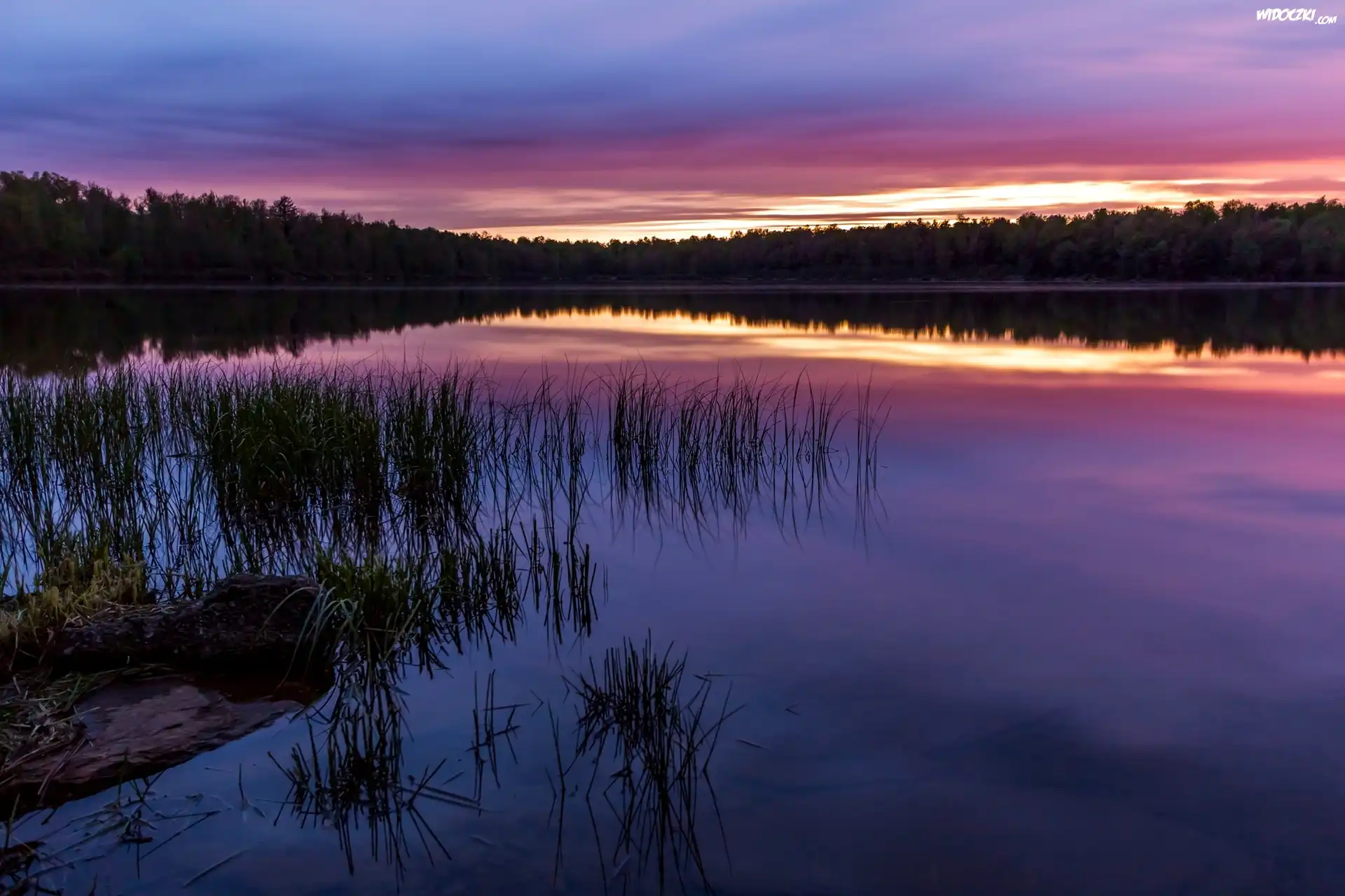 Zdjęcia, Zachód, Słońca, Jezioro, Drzewa, Trawa, Odbicie