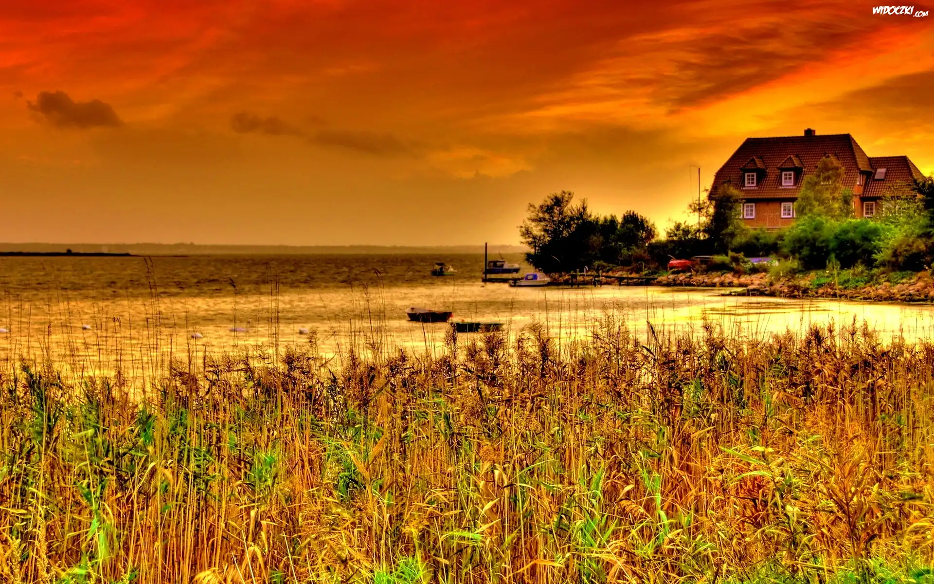 Zachód, Słońca, Jezioro, Trawa, Dom