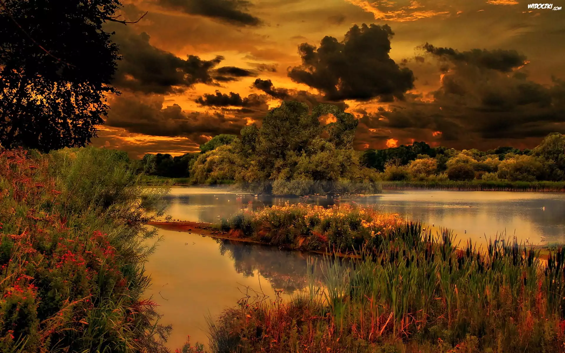 Zachód, Słońca, Jezioro, Trawa, Drzewa