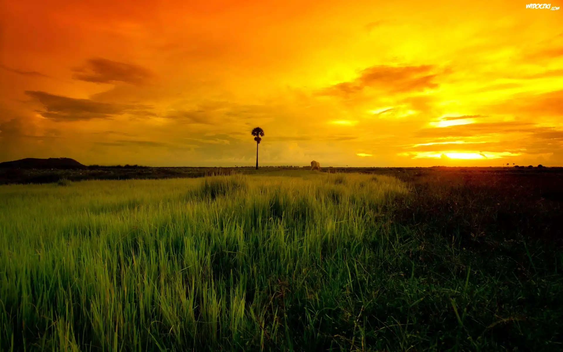 Zdjęcia, Zachód, Słońca, Pola, Trawa, Palma