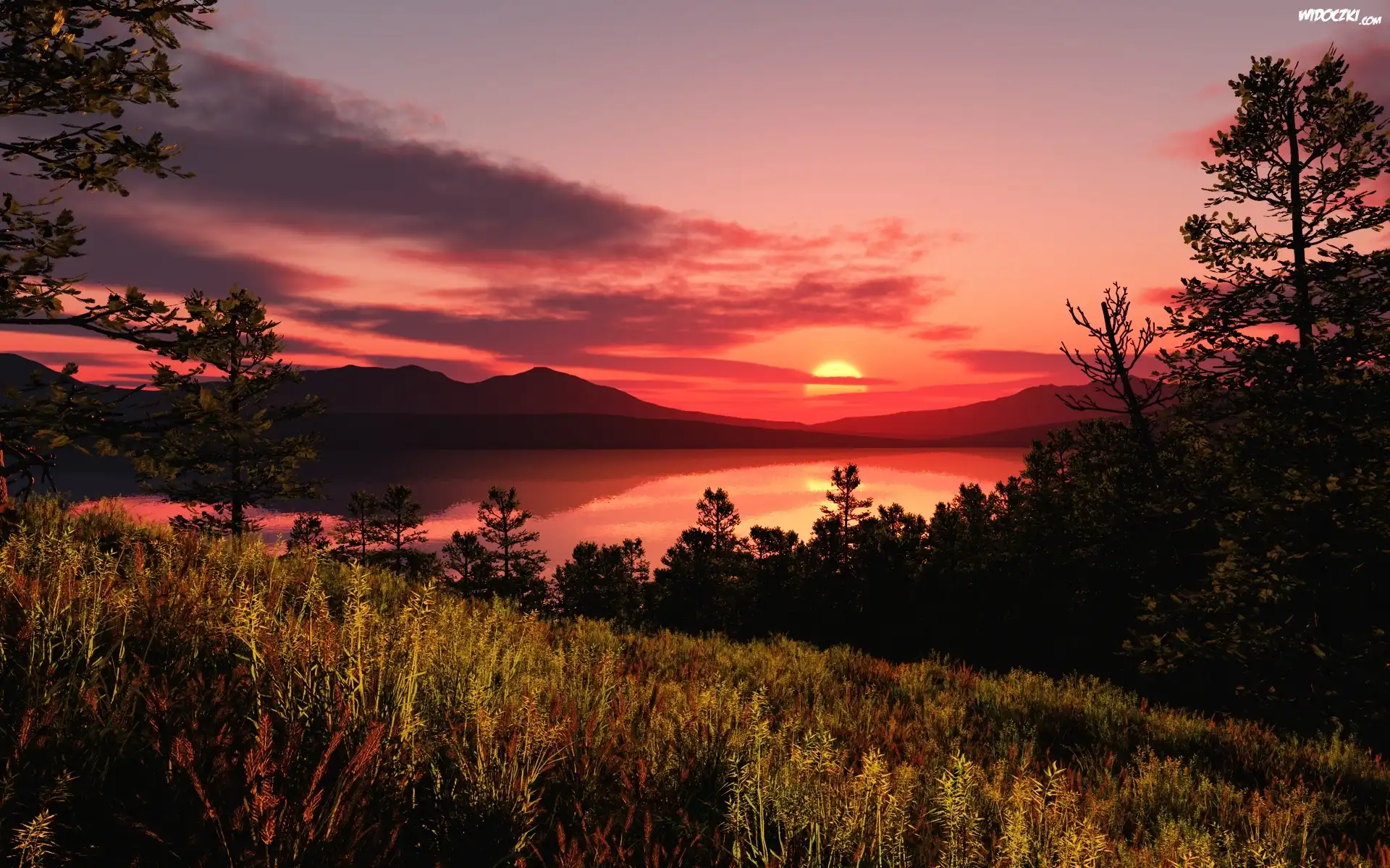 Zdjęcia, Zachód Słońca, Trawa, Drzewa