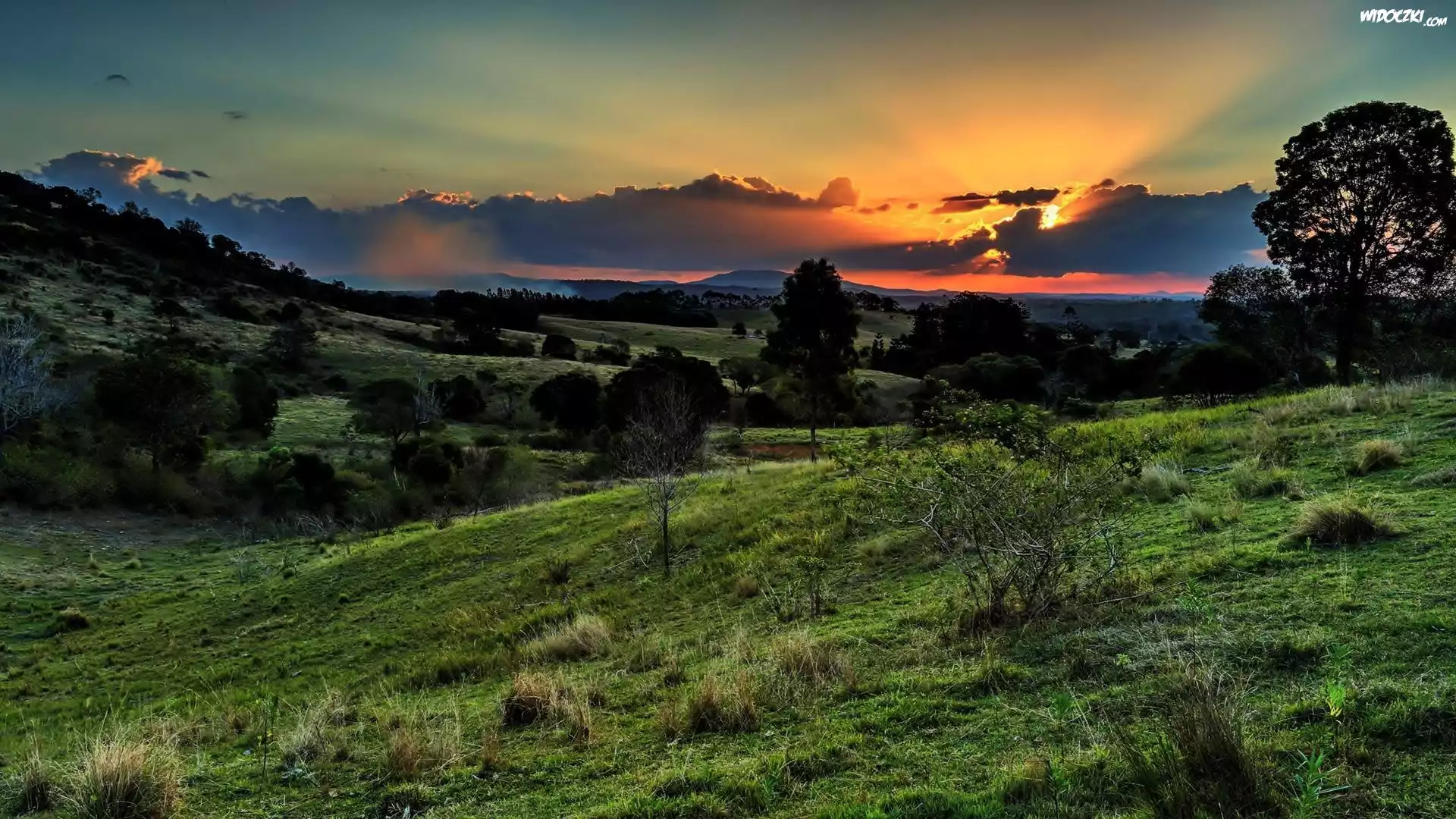 Zdjęcia, Zachód, Słońca, Chmury, Trawy, Drzewa