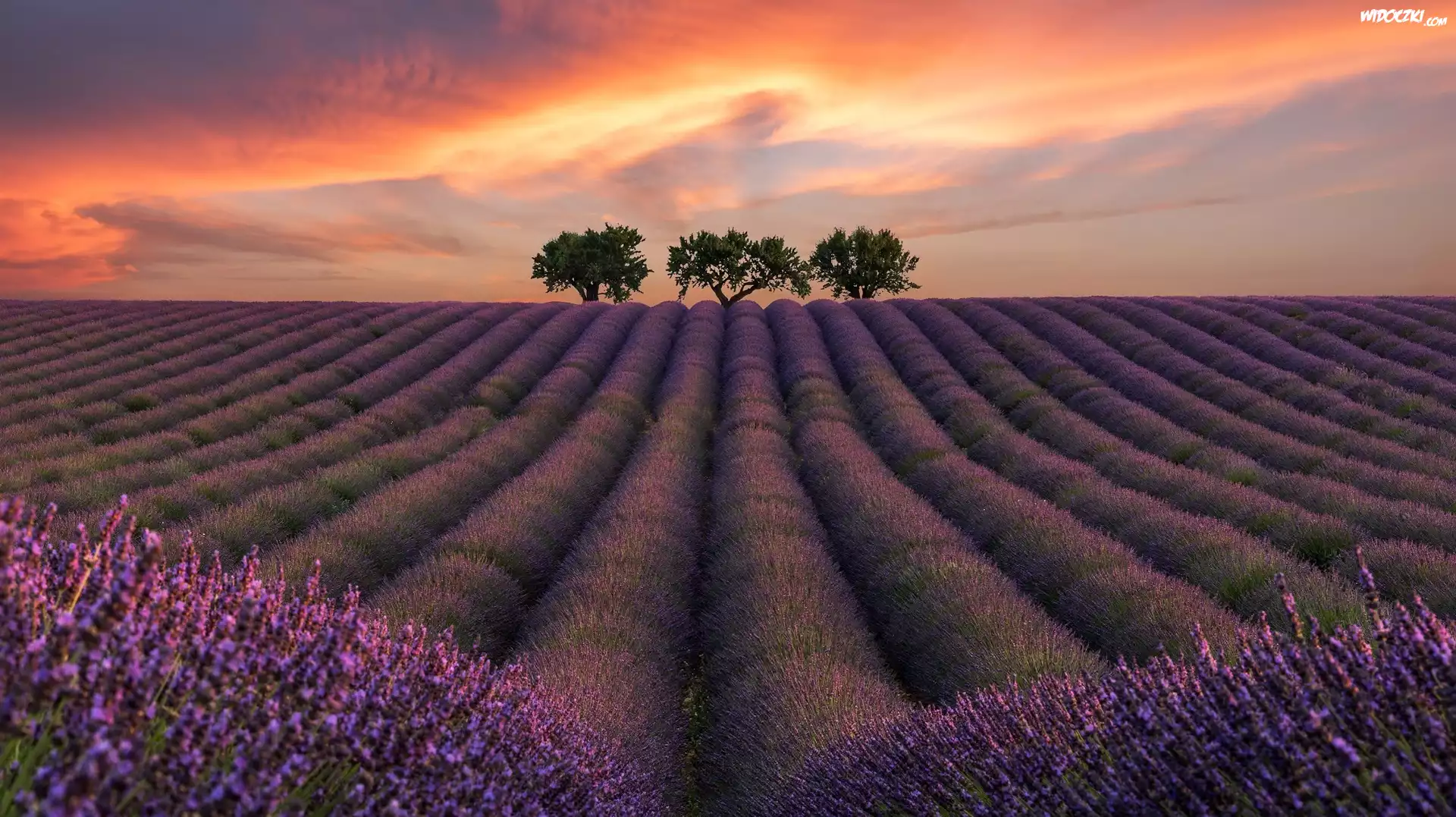 Zdjęcia, Zachód słońca, Pole, Lawenda, Trzy, Drzewa
