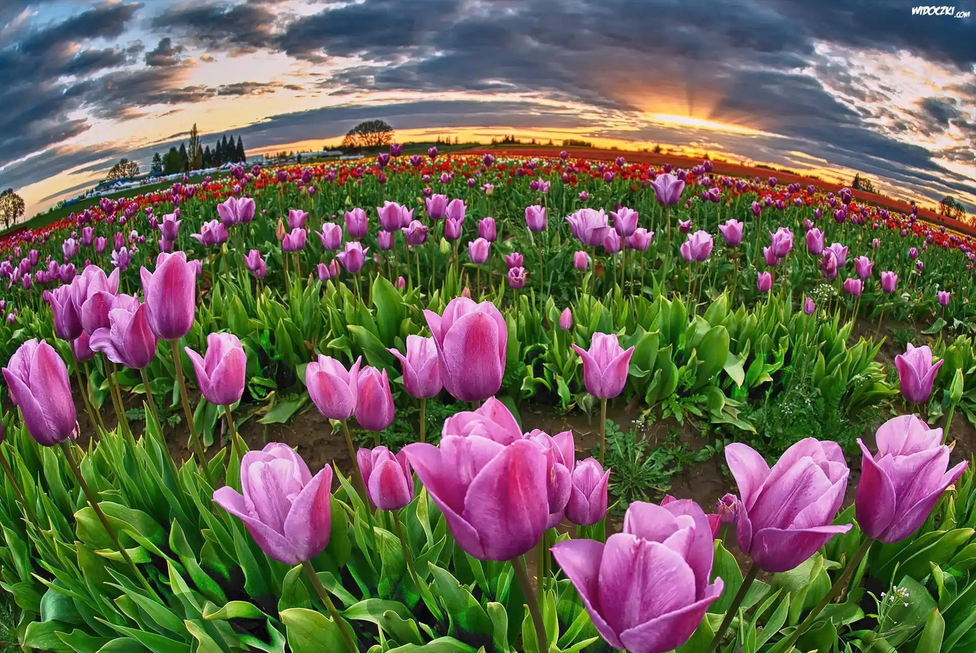 Zdjęcia, Zachód, Słońca, Uprawa, Tulipanów