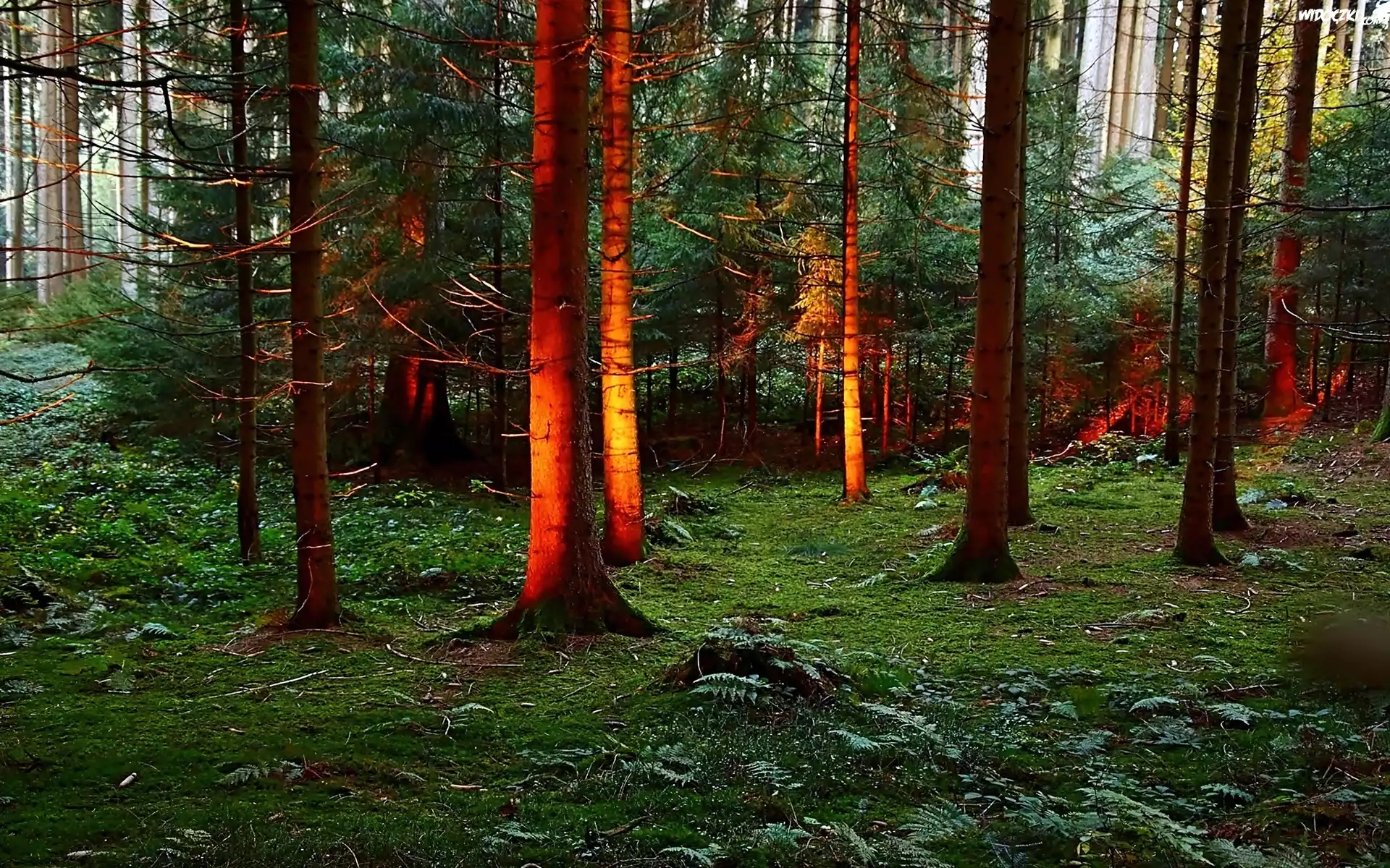 Zdjęcia, Zachód, Słońca, Las, Świerkowy, Światło, Cień