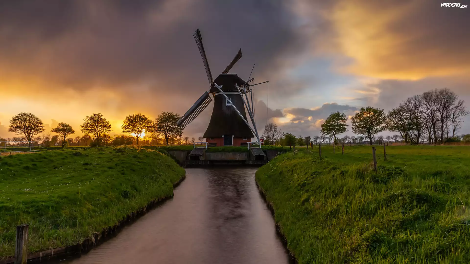 Rzeka, Pole, Drzewa, Zachód słońca, Wiatrak