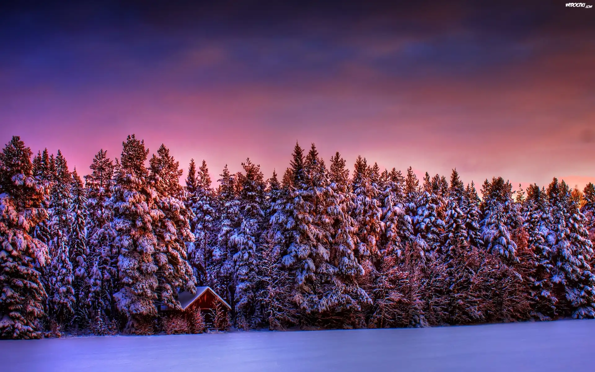 Zdjęcia, Zachód, Słońca, Świerki, Zima