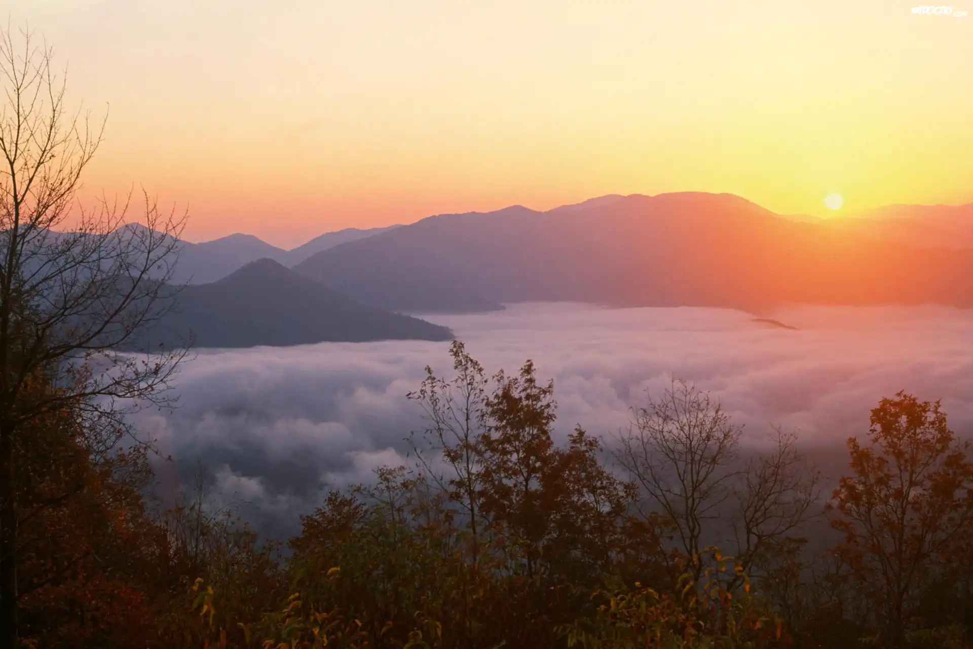 Zdjęcia, Zachód, Słońca, Góry, Wierzchołki, Drzew