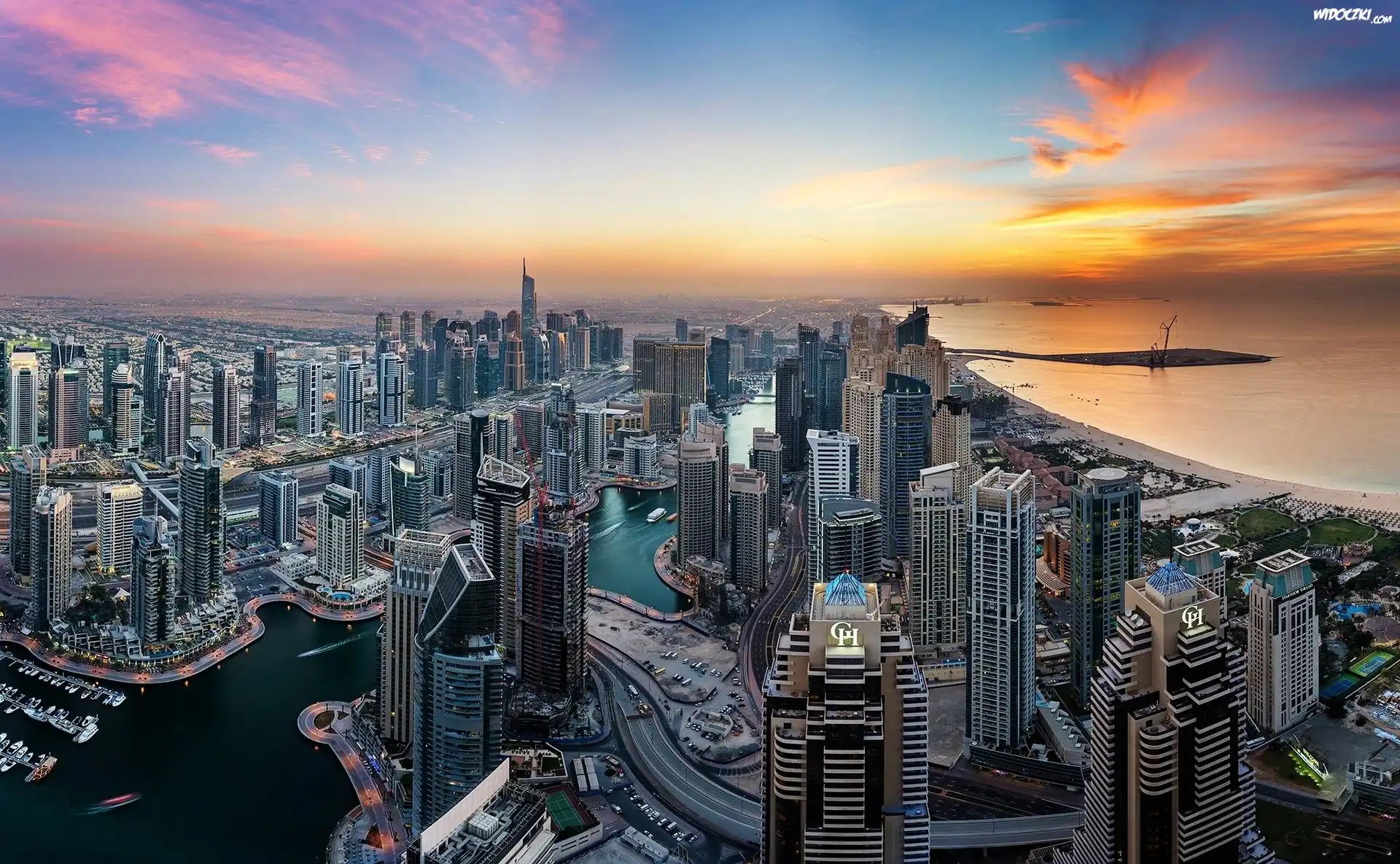 Zdjęcia, Wieżowce, Zachód Słońca, Morze, Z lotu ptaka