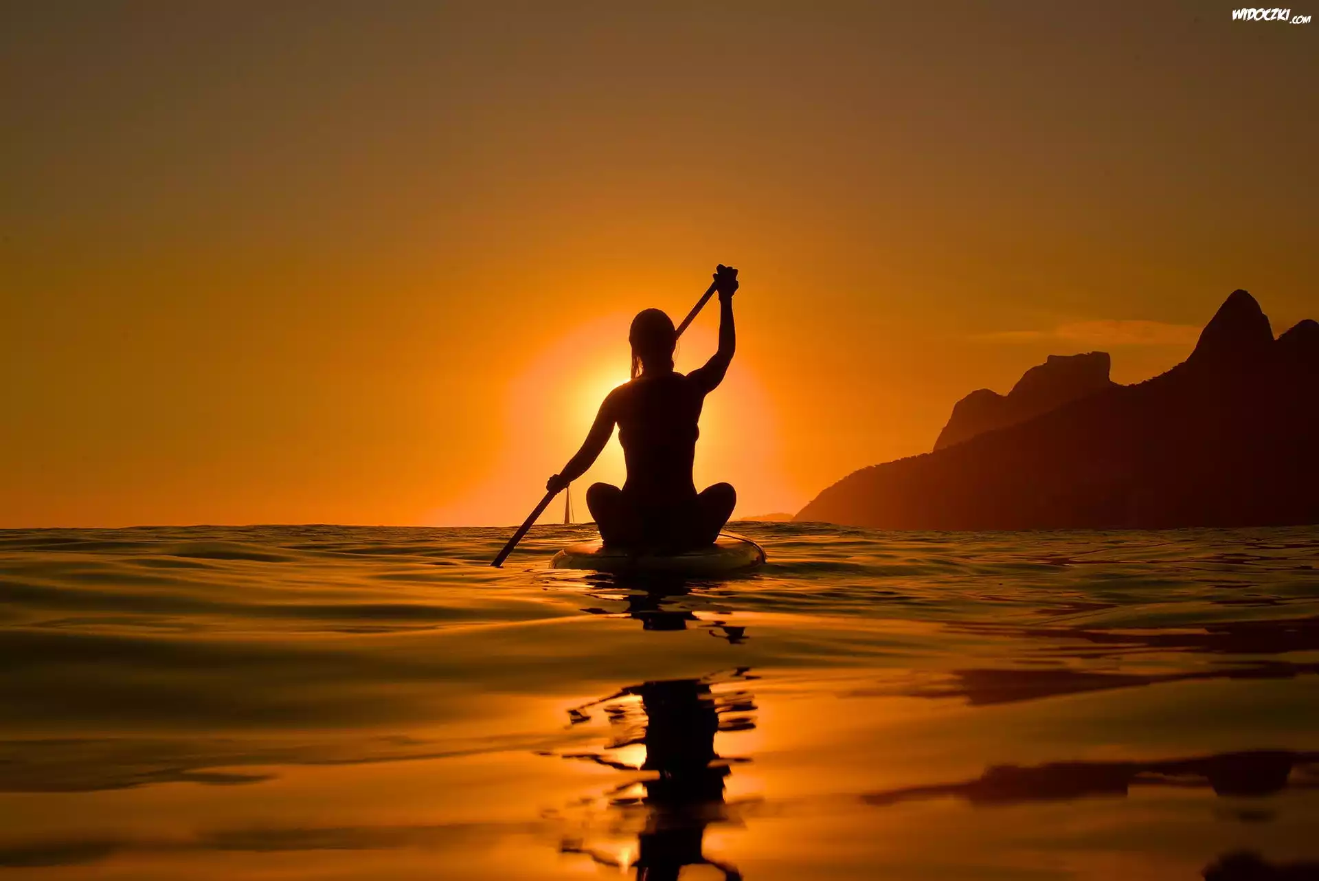 Zachód, Słońca, Jezioro, Kobieta, Wiosło, Góry