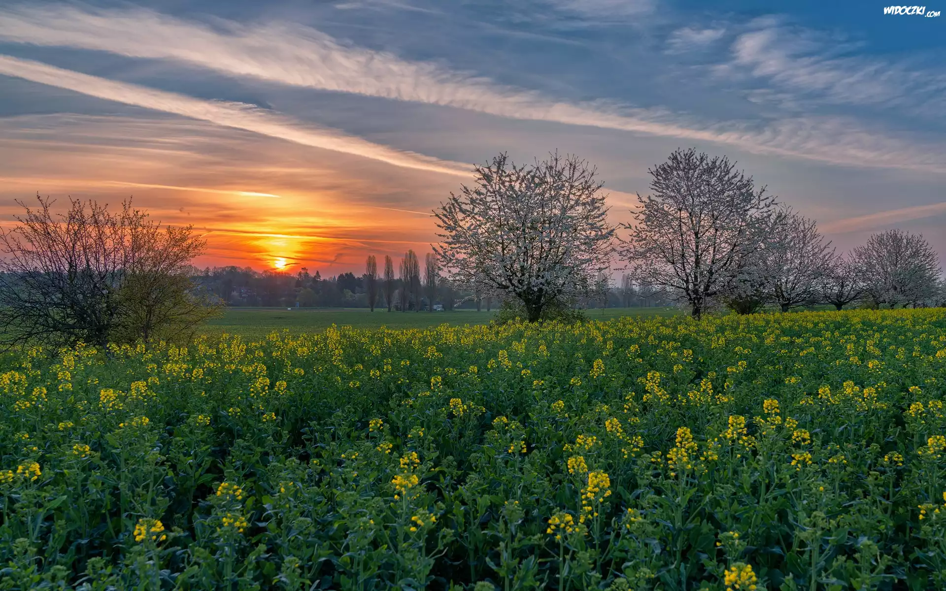 Zdjęcia, Drzewa, Pole, Rzepak, Zachód słońca, Wiosna