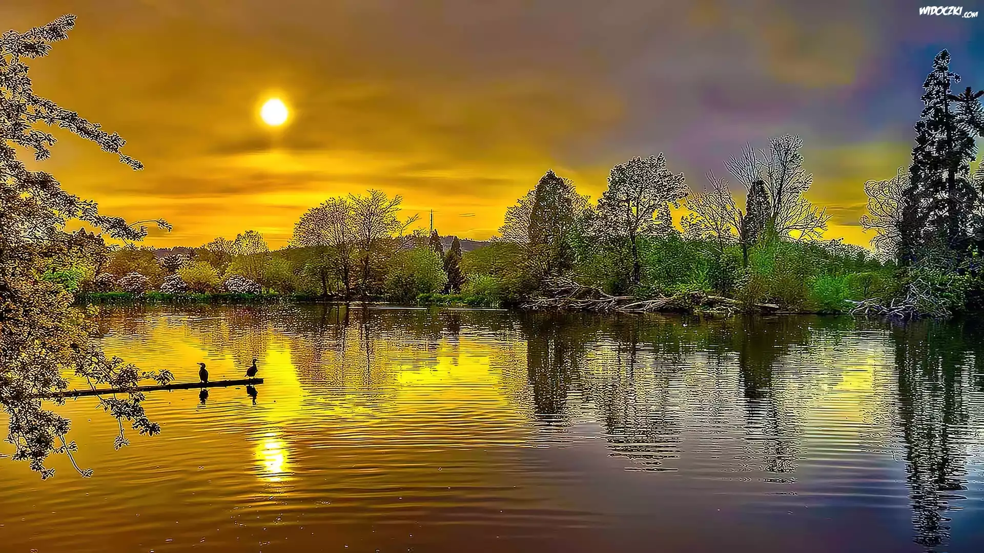 Zdjęcia, Zachód, Słońca, Woda, Drzewa