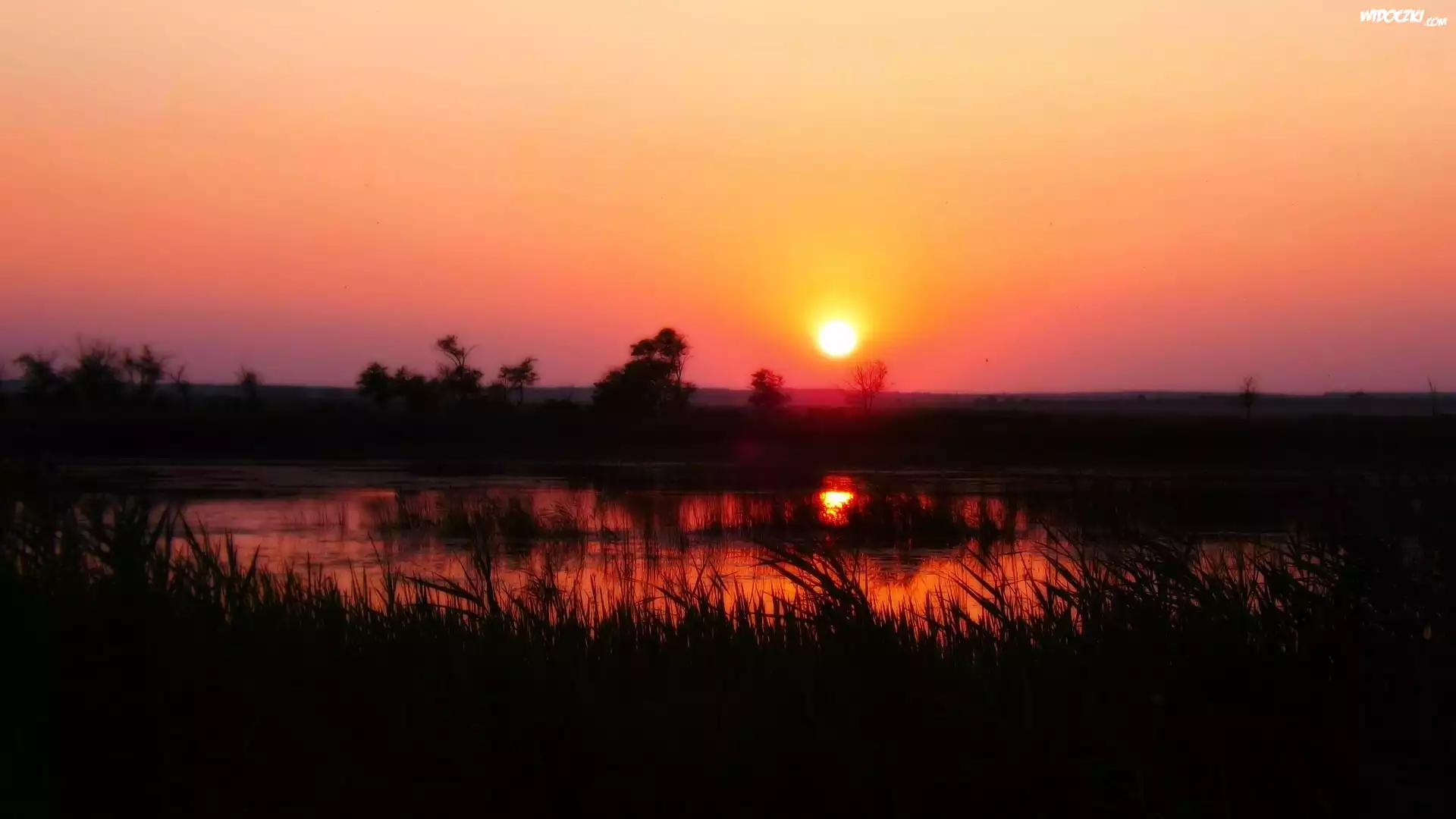 Zdjęcia, Zachód, Słońca, Woda, Szuwary