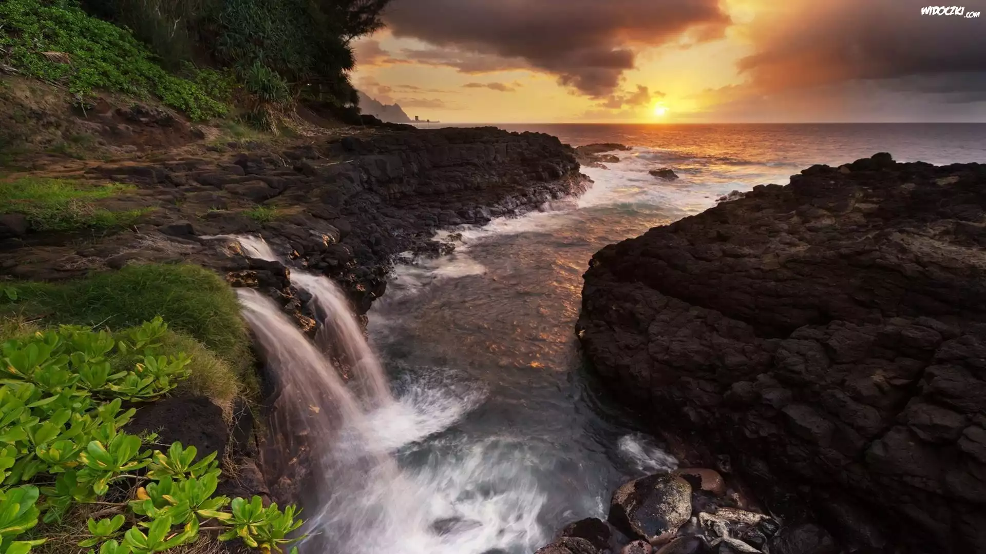 Zachód, Słońca, Morze, Wodospad, Skały