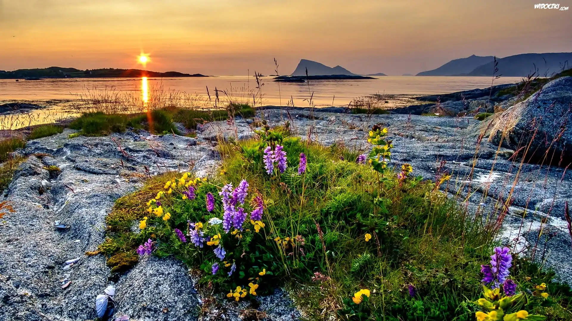 Zdjęcia, Zachód, Słońca, Morze, Wybrzeże, Kwiaty