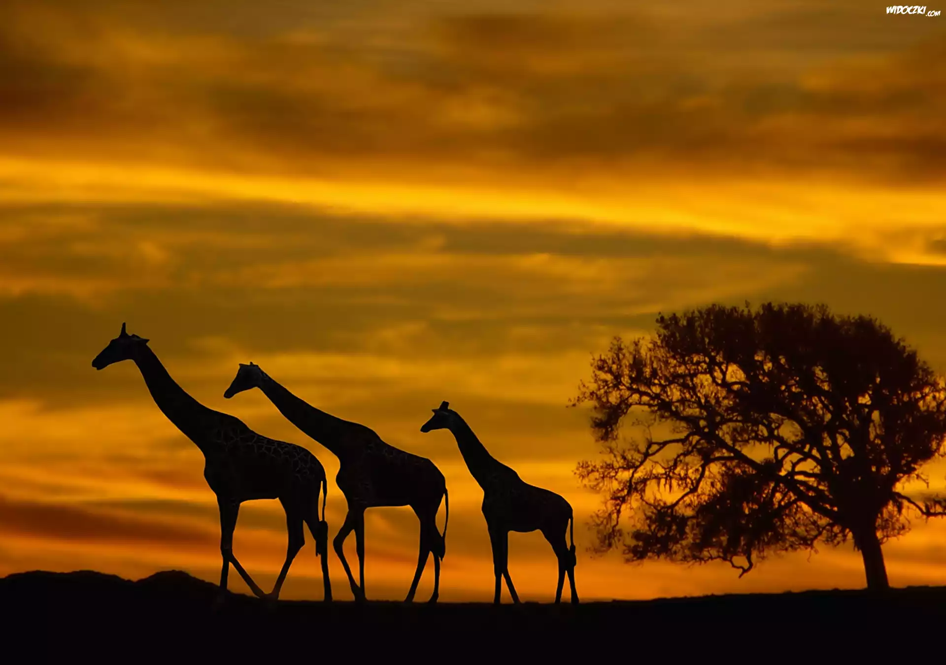 Zdjęcia, Żyrafy, Zachód, Słońca