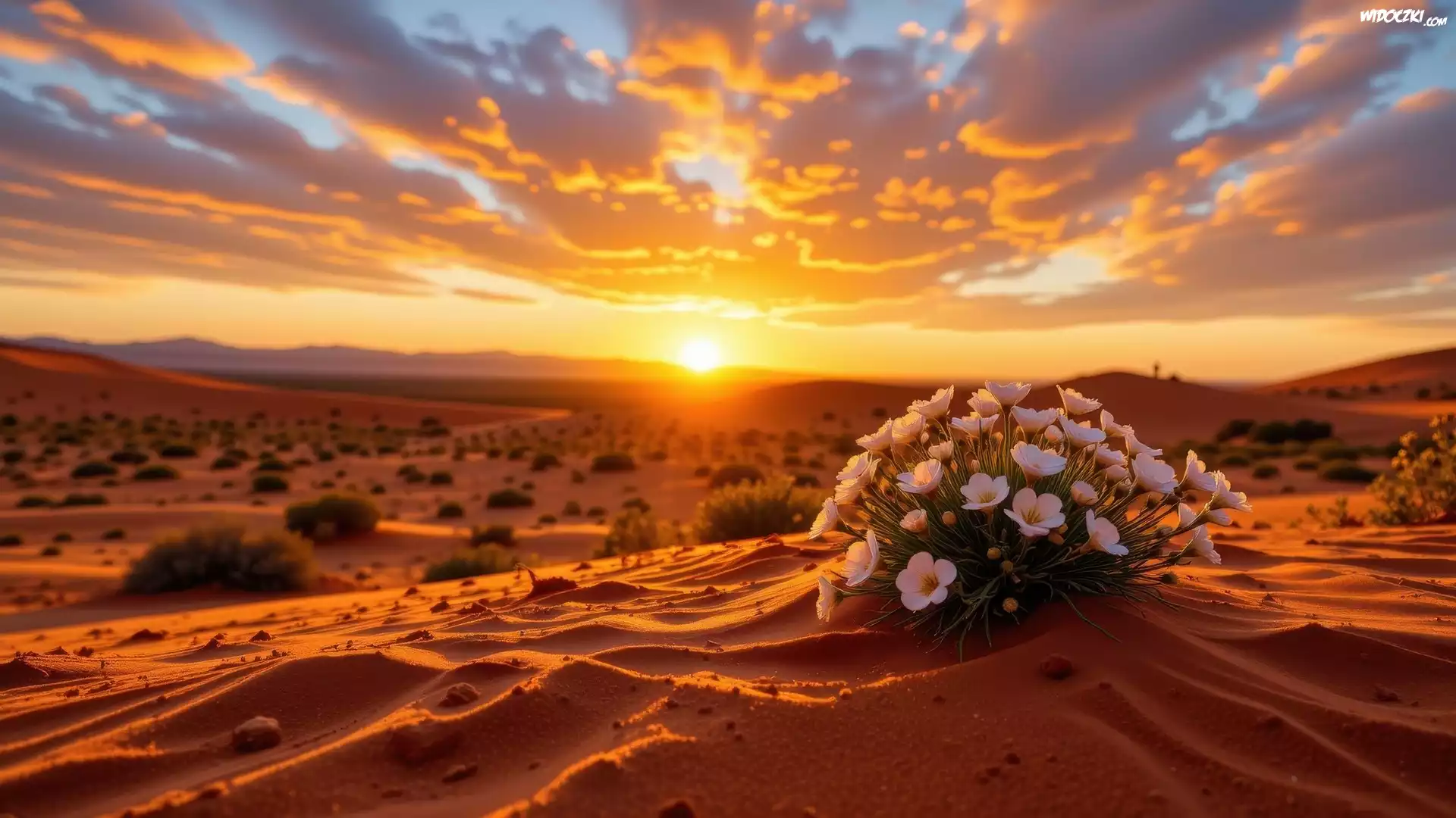 Zdjęcia, Zachód słońca, Pustynia, Kępka, Białych, Kwiatów, Kępki, Roślin, Zachód słońca