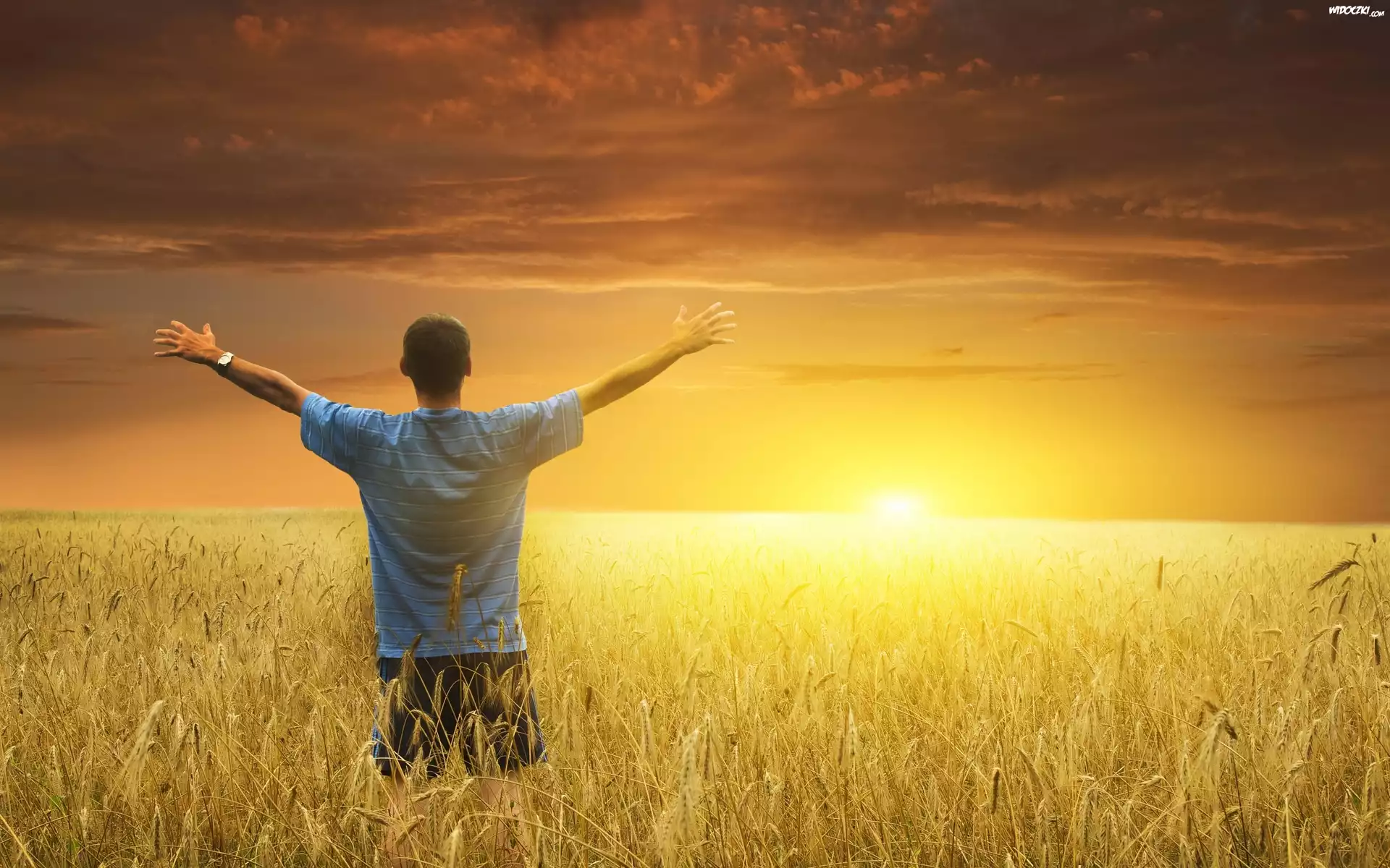 Zachód, Słońca, Chmury, Zboża, Mężczyzna