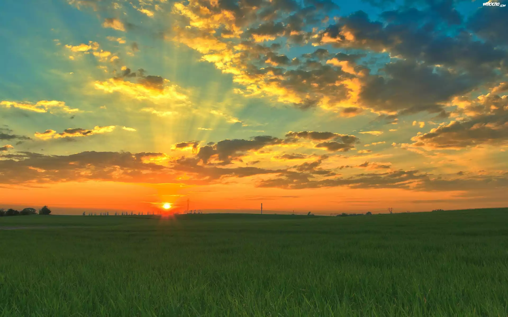 Zdjęcia, Zachód, Słońca, Zielone, Pola