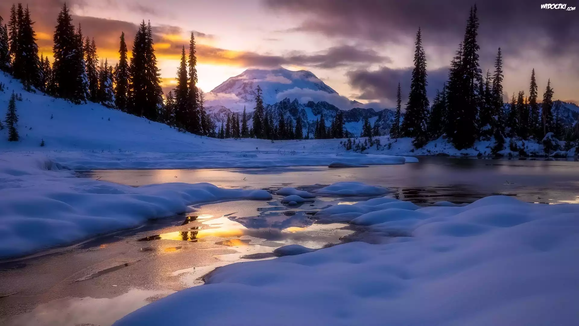 Zima, Zachód słońca, Ośnieżone, Góry, Rzeka, Drzewa
