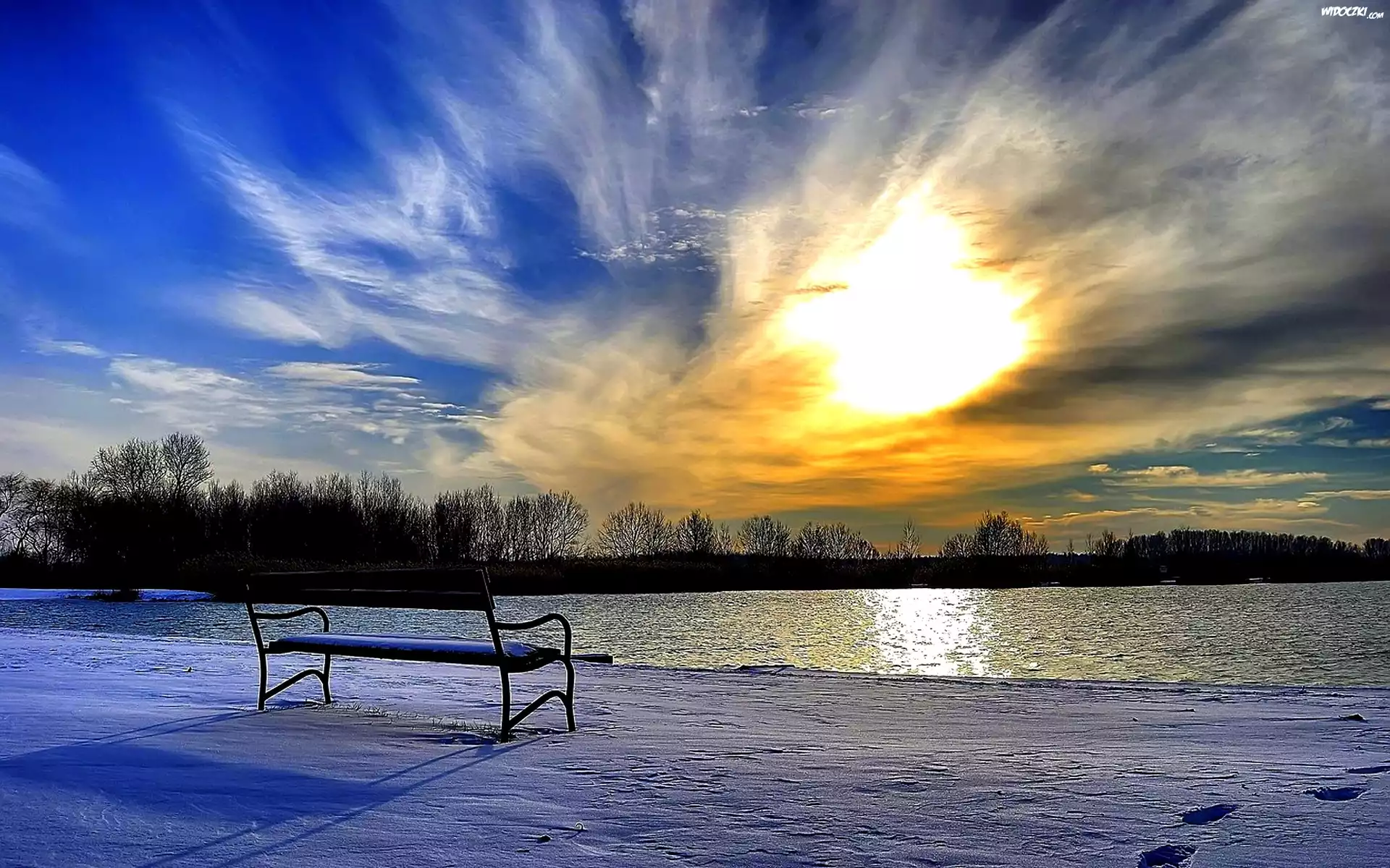 Zdjęcia, Zachód Słońca, Jezioro, Zima, Ławka