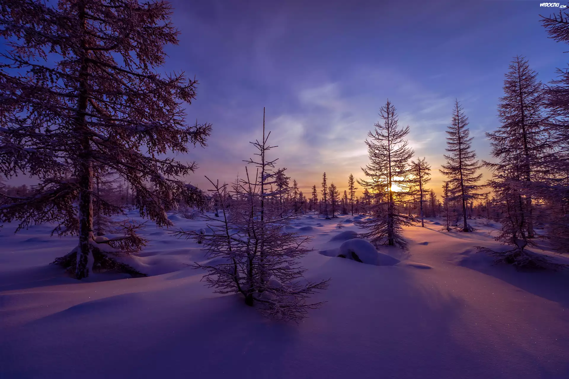Zdjęcia, Zachód słońca, Zima, Drzewa