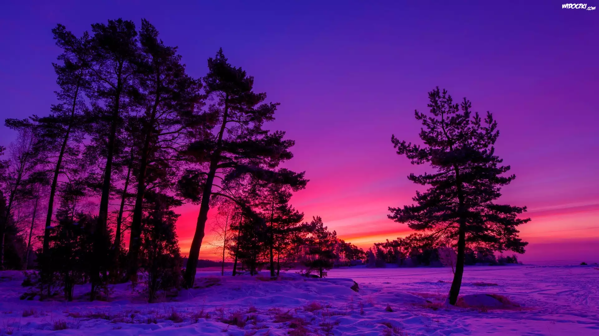 Zdjęcia, Zachód słońca, Zima, Drzewa