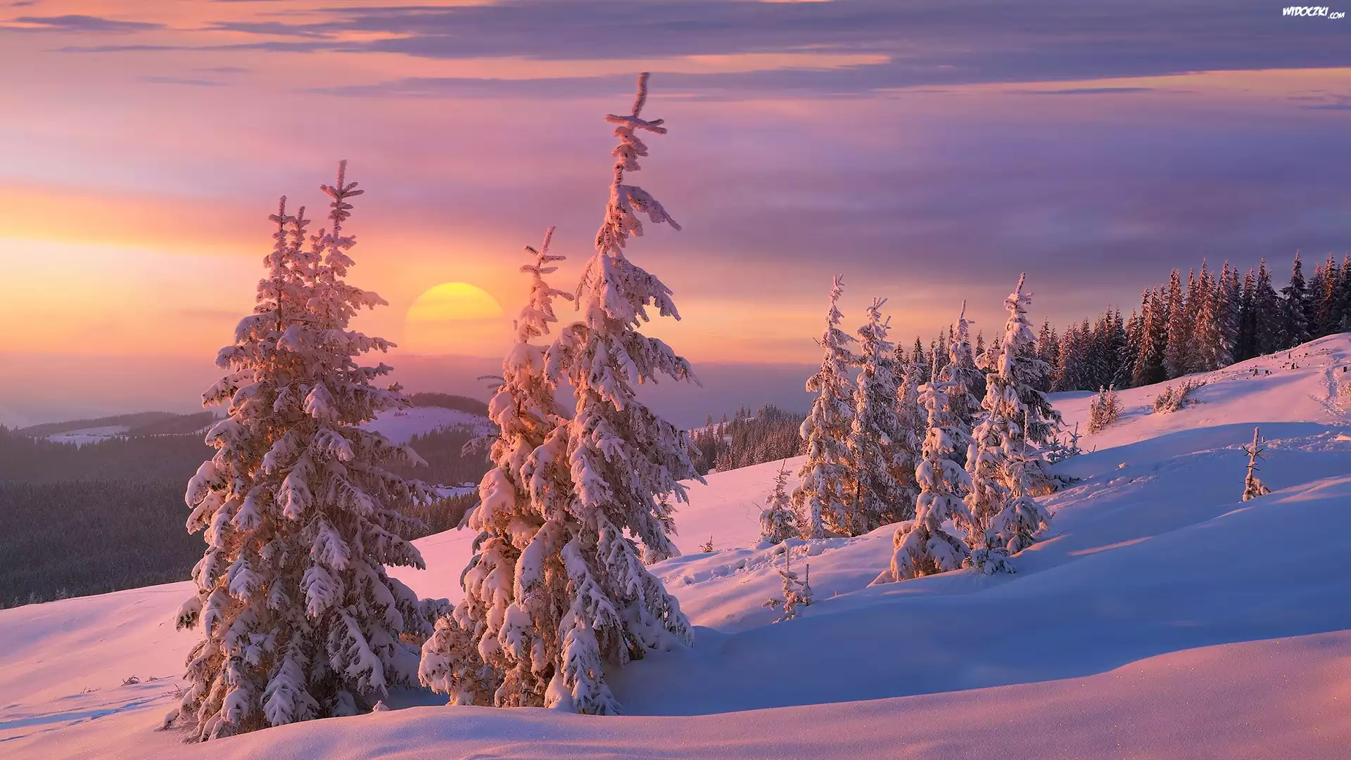 Zima, Zachód słońca, Góry, Las, Ośnieżone, Świerki