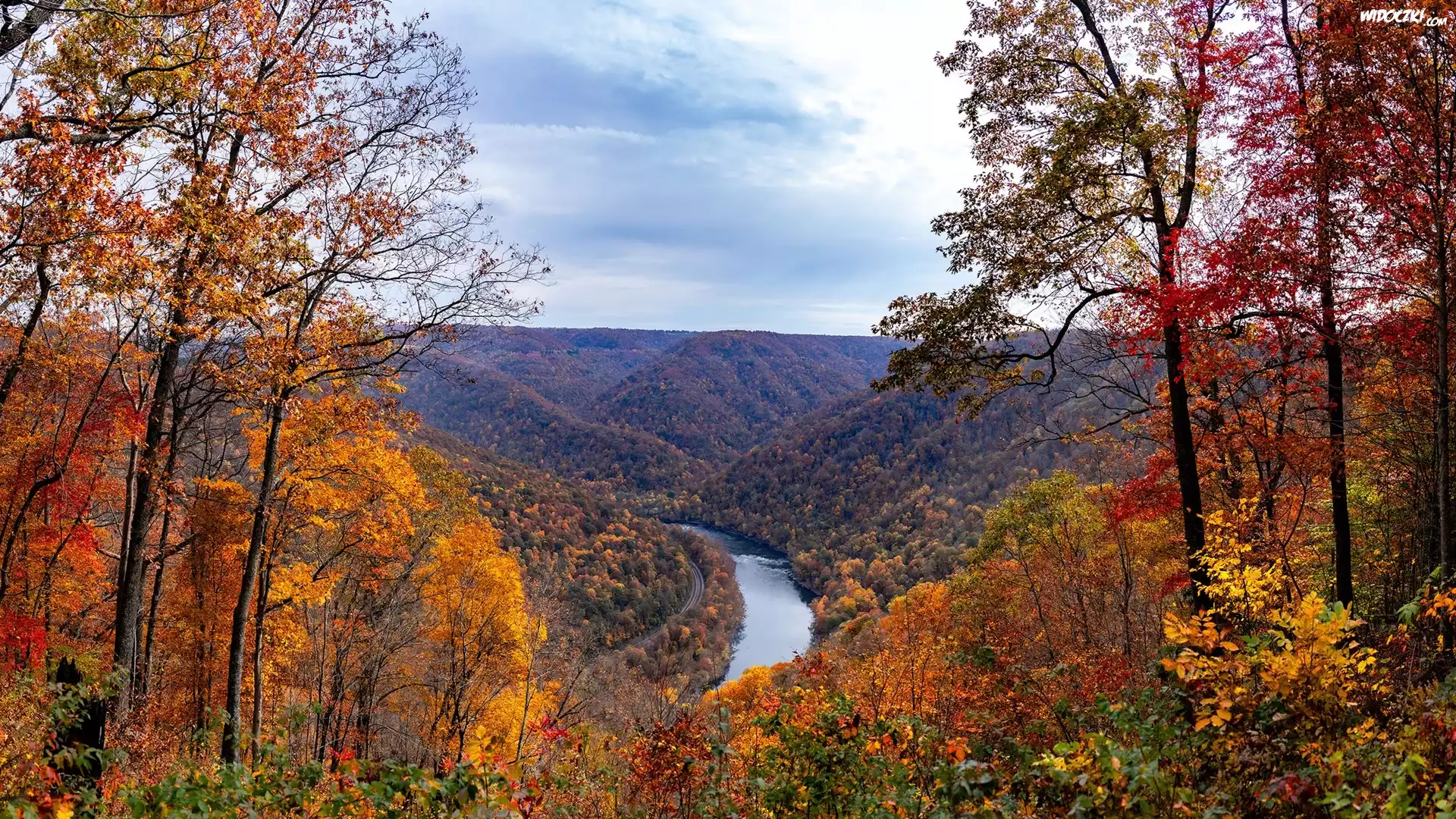 Stany Zjednoczone, Wirginia Zachodnia, Wąwóz, Rzeka, New River Gorge Bridge, Jesień, Drzewa, Lasy |